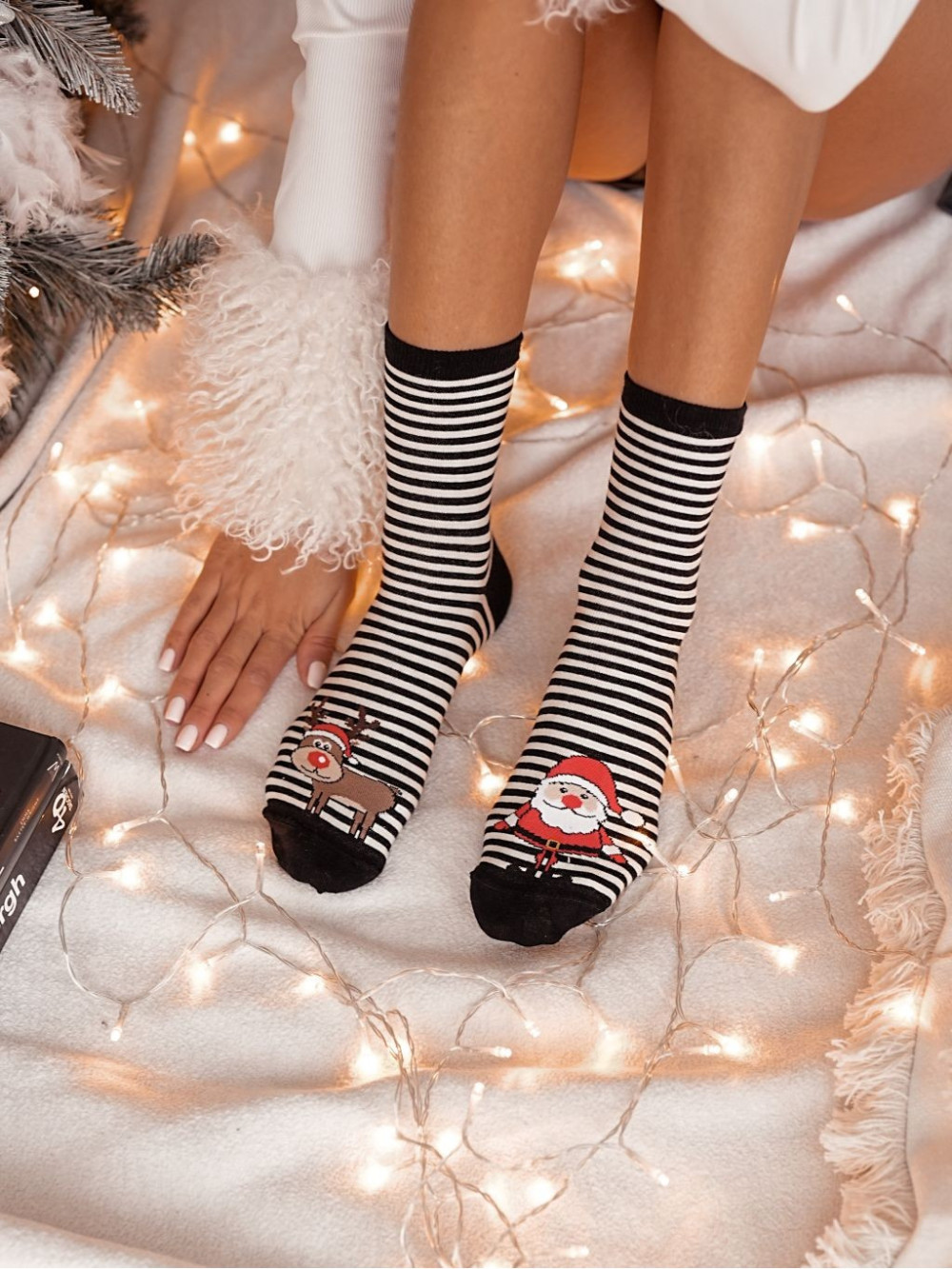 Damskie świąteczne skarpetki z printem Świętego Mikołaja i renifera.