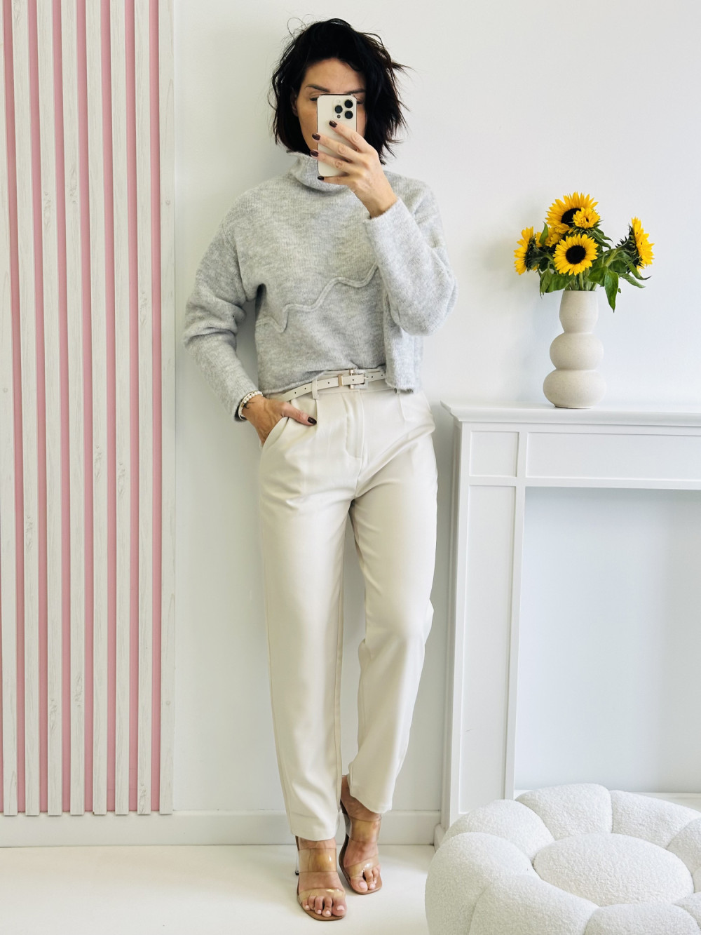 Sweter oversize z półgolfem to idealne połączenie wygody i stylu. Luźny krój zapewnia swobodę ruchów i modny, nonszalancki wygląd, a półgolf dodaje mu elegancji i ciepła. Długie rękawy sprawiają, że to doskonały wybór na chłodniejsze dni – świetnie prezentuje się zarówno z jeansami, jak i spódnicą.