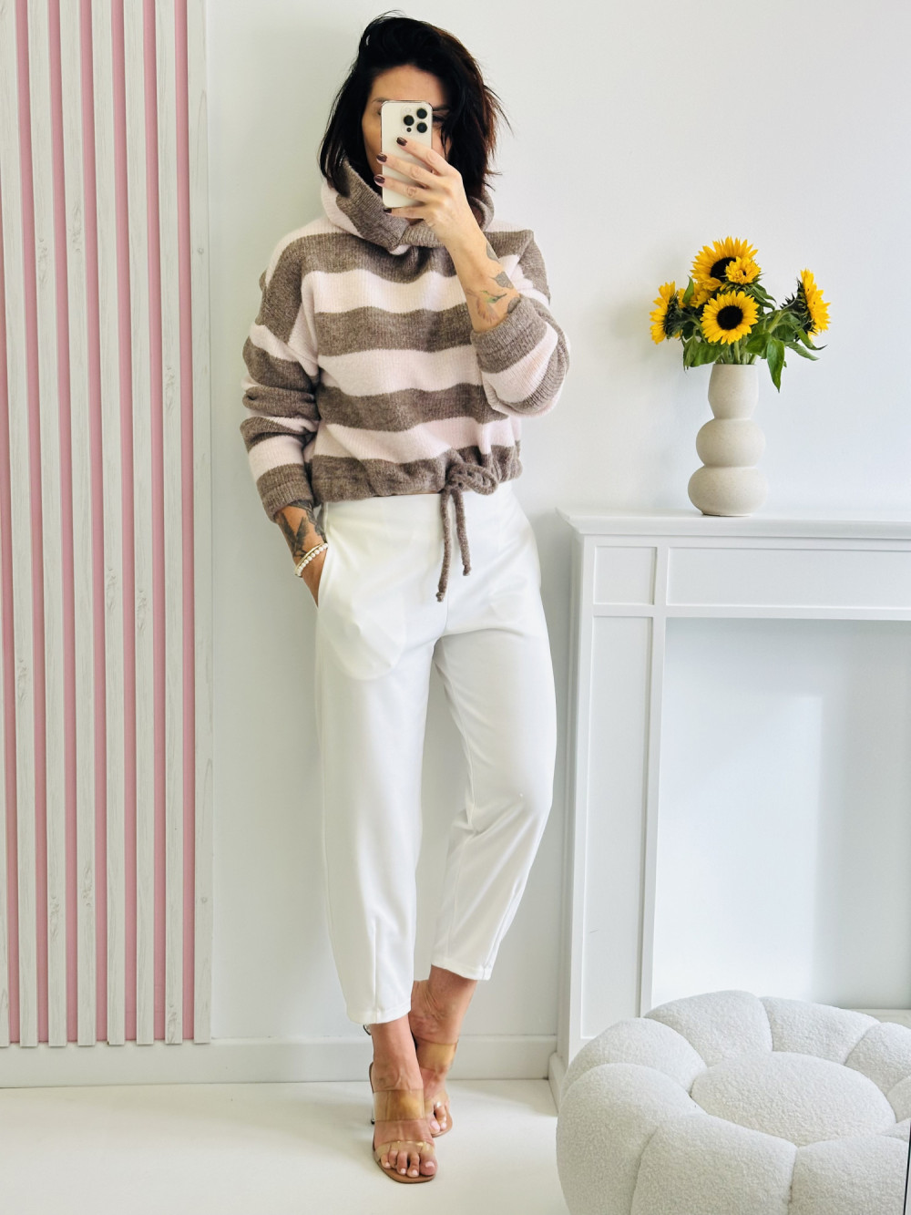Sweter w paski z kapturem to połączenie stylu i wygody w codziennym wydaniu. Długie rękawy oraz miękki, przyjemny w dotyku materiał zapewniają komfort noszenia, a kaptur dodaje mu sportowego, luźnego charakteru. Modny wzór w paski sprawia, że sweter świetnie uzupełni zarówno casualowe, jak i bardziej miejskie stylizacje.