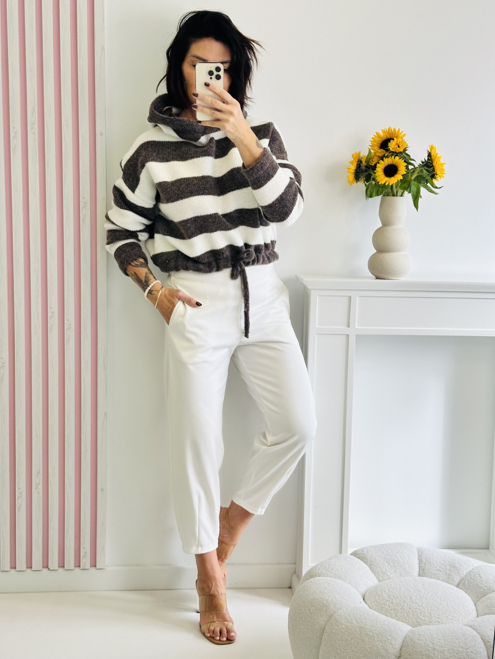 Sweter w paski z kapturem to połączenie stylu i wygody w codziennym wydaniu. Długie rękawy oraz miękki, przyjemny w dotyku materiał zapewniają komfort noszenia, a kaptur dodaje mu sportowego, luźnego charakteru. Modny wzór w paski sprawia, że sweter świetnie uzupełni zarówno casualowe, jak i bardziej miejskie stylizacje.