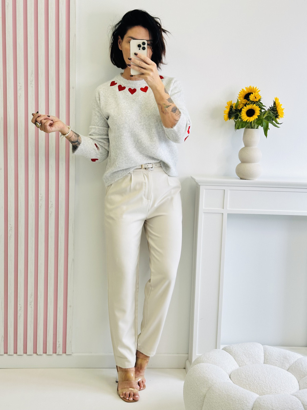 Sweter z długim rękawem ozdobiony uroczymi serduszkami przy rękawie i dekolcie to stylowa propozycja o romantycznym charakterze. Delikatne detale nadają mu subtelności i kobiecego uroku, a miękki materiał gwarantuje wygodę noszenia. Idealny na chłodniejsze dni, doskonale sprawdzi się zarówno w codziennych, jak i bardziej eleganckich stylizacjach.