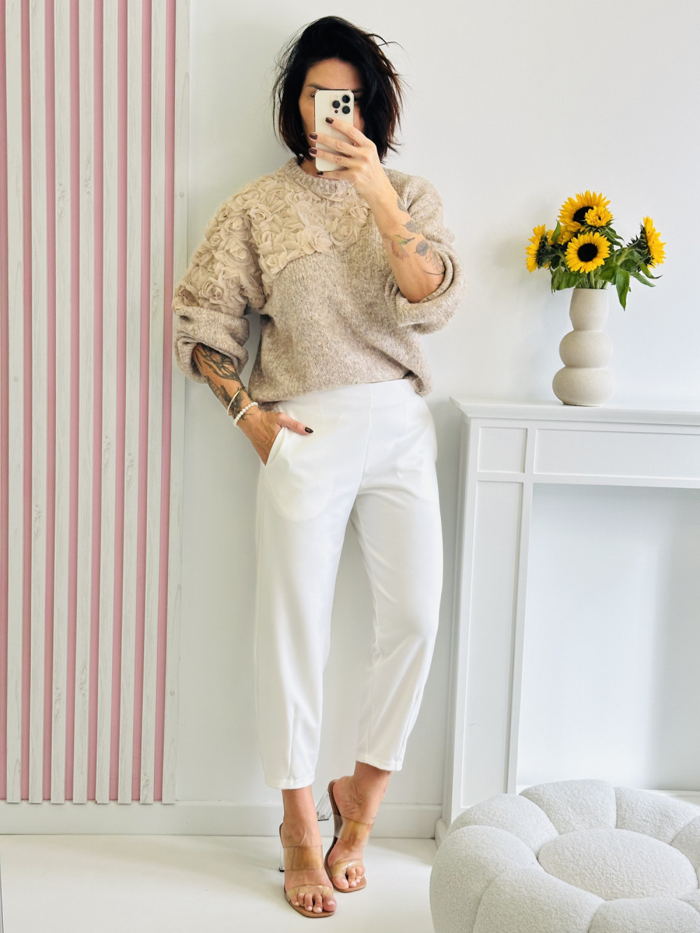 Beżowy sweter z delikatnymi kwiatkami po bokach to elegancka i kobieca propozycja na każdą okazję. Subtelne zdobienia w tonacji beżu dodają mu uroku i klasy, tworząc spójną, harmonijną całość. Wykonany z miękkiego materiału, zapewnia wygodę i stylowy wygląd zarówno w codziennych, jak i bardziej eleganckich stylizacjach.