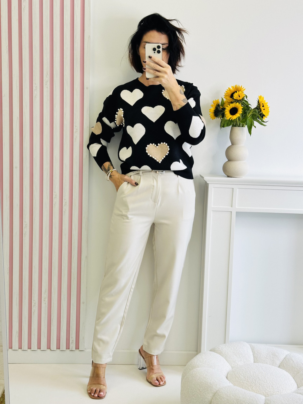 Sweter z długim rękawem ozdobiony jasno beżowymi serduszkami to urocza i kobieca propozycja na chłodniejsze dni. Delikatne serduszka dodają mu subtelnego uroku i romantycznego charakteru, a miękki materiał zapewnia komfort noszenia. Idealny do codziennych stylizacji, świetnie komponuje się zarówno z jeansami, jak i spódnicą, tworząc przytulny i stylowy look.