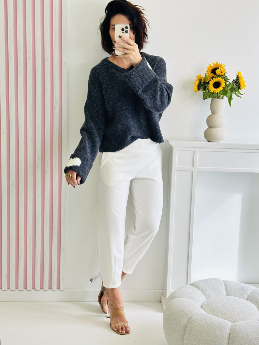 Szary sweter oversize z długim rękawem i uroczymi sercami na rękawach to połączenie wygody i subtelnego uroku. Luźny krój zapewnia swobodę ruchów i modny, casualowy wygląd, a dekoracyjne serduszka dodają całości dziewczęcego charakteru. Wykonany z miękkiego materiału, idealnie sprawdzi się w codziennych stylizacjach, tworząc przytulny i stylowy look.