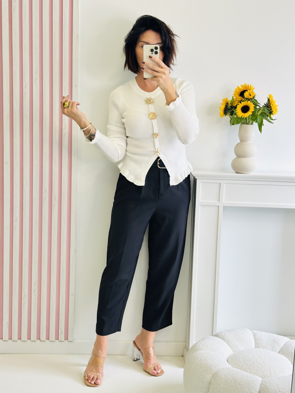 Bluzka z długim rękawem ozdobiona złotymi guzikami w kształtach inspirowanych oceanem to elegancka i wyjątkowa propozycja na każdą okazję. Unikalne detale nadają całości charakteru i subtelnego blasku, przyciągając wzrok i dodając stylizacji oryginalności. Wykonana z miękkiego, przyjemnego w dotyku materiału, zapewnia komfort noszenia i doskonale komponuje się zarówno ze spodniami, jak i spódnicą.