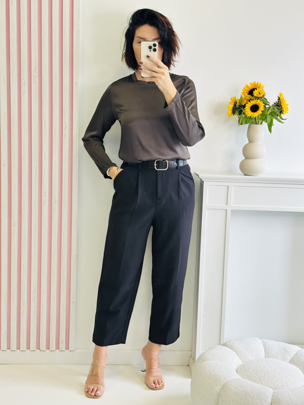 Brązowa bluzka z długim rękawem to klasyczna i elegancka propozycja na każdą okazję. Jej stonowany kolor i prosty krój sprawiają, że doskonale komponuje się z różnorodnymi elementami garderoby. Wykonana z miękkiego, przyjemnego w dotyku materiału, zapewnia komfort noszenia przez cały dzień.