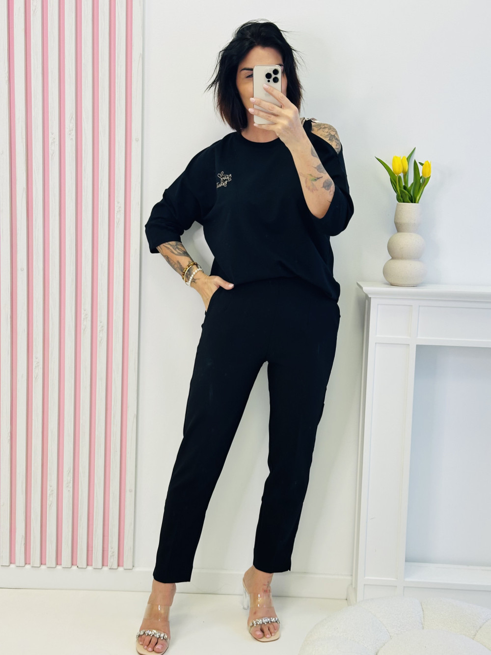 Czarna bluza z długim rękawem to wyjątkowa propozycja dla kobiet ceniących modny i niebanalny styl. Ozdobny otwór na ramieniu, subtelnie podkreślony wstążką, nadaje jej kobiecego uroku i oryginalnego charakteru. Wykonana z miękkiego, przyjemnego w dotyku materiału, zapewnia komfort noszenia i doskonale sprawdzi się w stylizacjach na co dzień i na wieczorne wyjścia.