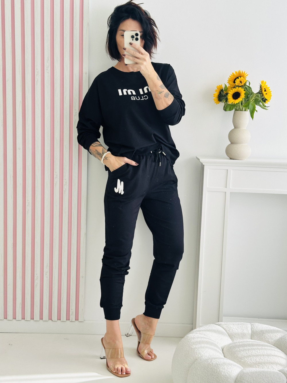 Czarny komplet to nowoczesna i wygodna propozycja idealna na co dzień. Bluzka z długim rękawem ozdobiona dużym, białym napisem z przodu nadaje całości modnego, miejskiego charakteru. Spodnie z gumką w pasie i kieszeniami zapewniają komfort noszenia i swobodę ruchów, tworząc razem stylowy i praktyczny zestaw.