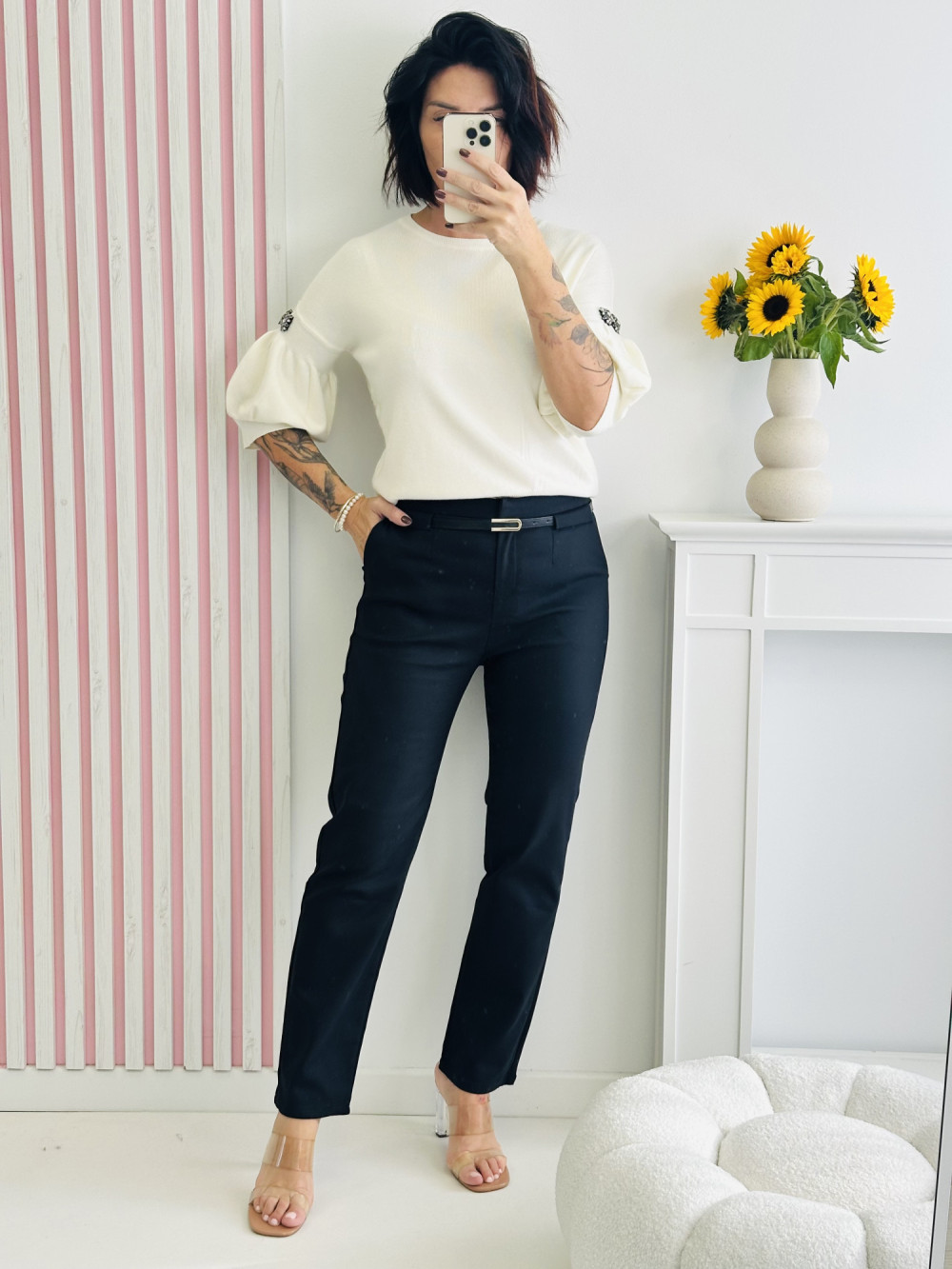 Czarne eleganckie spodnie z kieszeniami to stylowa propozycja dla kobiet ceniących klasykę z nutą nowoczesności. Dodatkowy czarny pasek z subtelnymi złotymi elementami pięknie podkreśla talię i dodaje całości eleganckiego wykończenia. Wykonane z wysokiej jakości materiału, zapewniają komfort noszenia i doskonale sprawdzą się zarówno w codziennych, jak i bardziej formalnych stylizacjach.