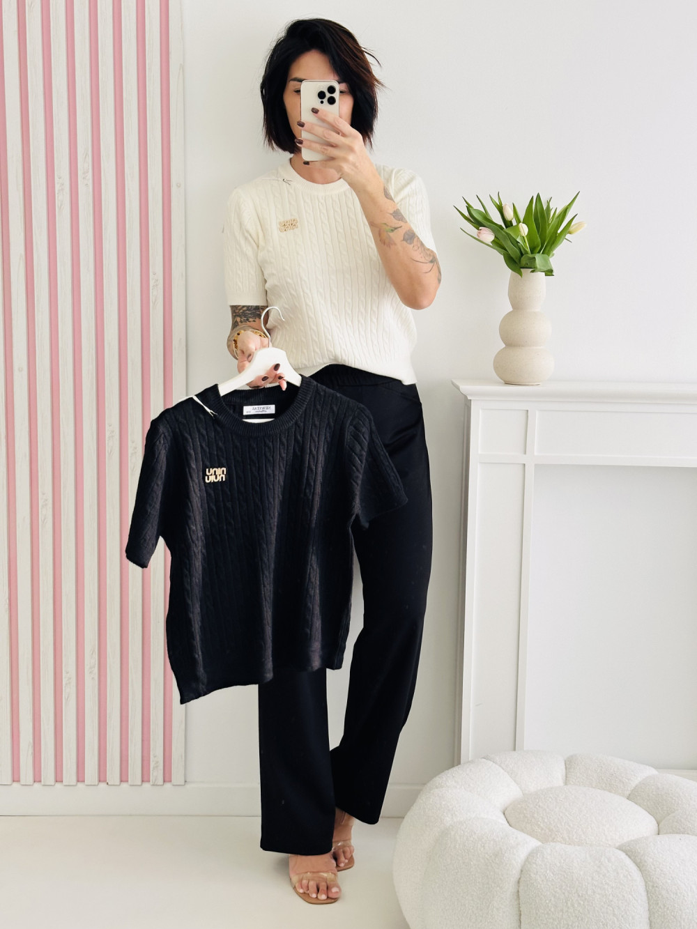 Stylowy sweter z krótkim rękawem to połączenie elegancji i nowoczesnego designu. Złoty element z przodu subtelnie przyciąga wzrok, dodając całości wyjątkowego charakteru. Wykonany z miękkiego, przyjemnego w dotyku materiału, doskonale sprawdzi się w codziennych oraz bardziej wyrafinowanych stylizacjach.
