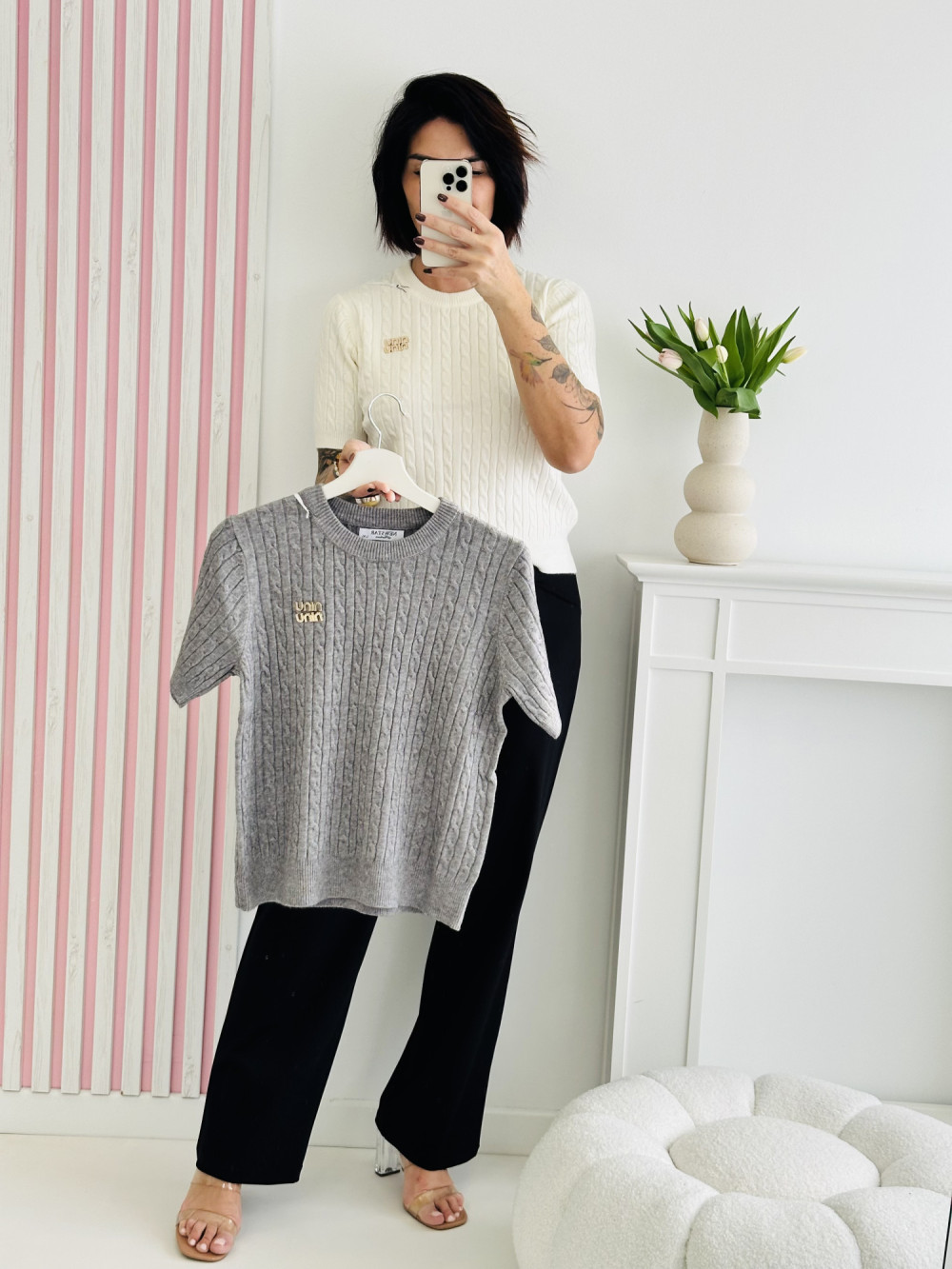 Stylowy sweter z krótkim rękawem to połączenie elegancji i nowoczesnego designu. Złoty element z przodu subtelnie przyciąga wzrok, dodając całości wyjątkowego charakteru. Wykonany z miękkiego, przyjemnego w dotyku materiału, doskonale sprawdzi się w codziennych oraz bardziej wyrafinowanych stylizacjach.
