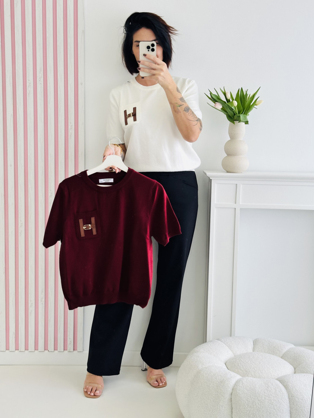 Stylowy sweter z krótkim rękawem to propozycja dla kobiet ceniących elegancję w codziennym wydaniu. Z przodu znajduje się praktyczna kieszonka ozdobiona skórzanym paskiem ułożonym w literę H, wykończonym złotym elementem, który dodaje całości szykownego charakteru. Miękki materiał i dopracowane detale sprawiają, że sweter prezentuje się wyjątkowo i doskonale uzupełni zarówno casualowe, jak i eleganckie stylizacje.