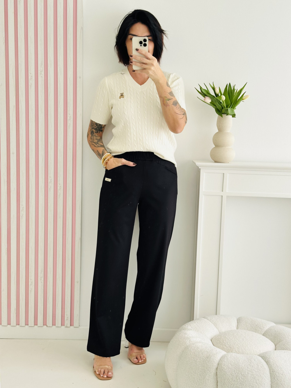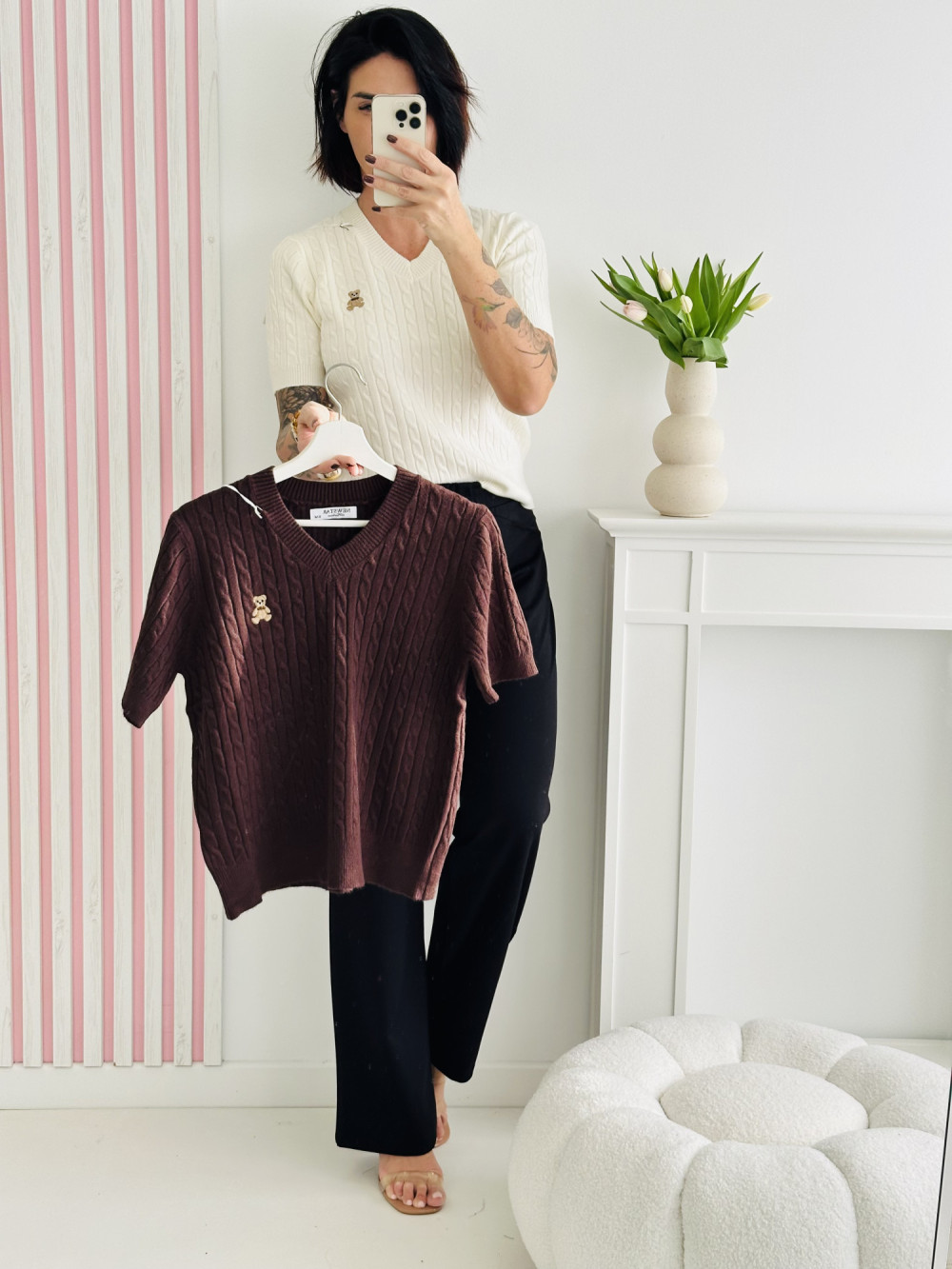Uroczy sweter z krótkim rękawem to idealne połączenie wygody i subtelnego wdzięku. Z przodu zdobi go mała aplikacja misia, która nadaje całości ciepłego i przyjaznego charakteru. Delikatny materiał i klasyczny krój sprawiają, że sweter doskonale sprawdzi się zarówno na co dzień, jak i w bardziej casualowych stylizacjach.