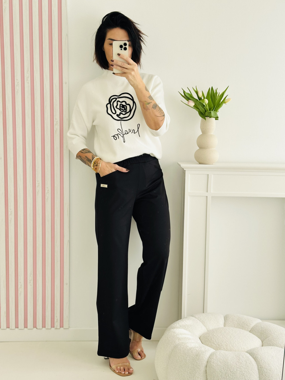 Stylowy sweter z rękawem 3/4 to połączenie elegancji i nowoczesnego akcentu. Z przodu zdobi go czarna róża oraz czarny napis, które nadają całości wyjątkowego charakteru. Miękki materiał i kobiecy krój sprawiają, że sweter doskonale podkreśla sylwetkę, będąc idealnym wyborem na co dzień i na specjalne okazje.