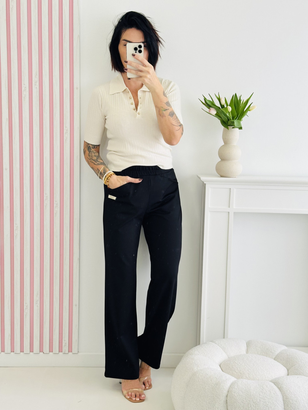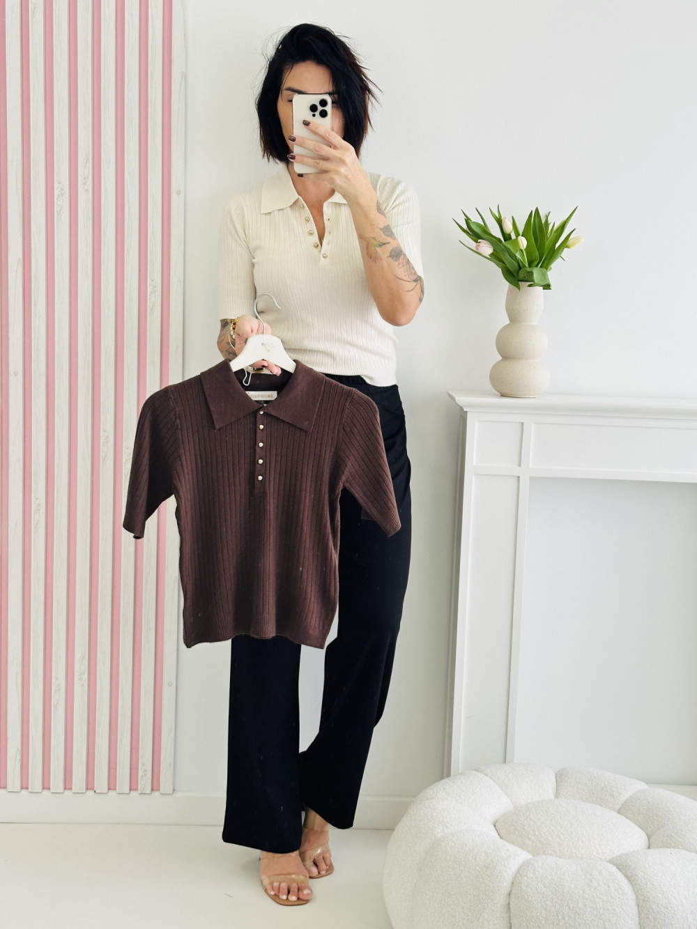 Elegancki sweter z krótkim rękawem to klasyka w nowoczesnym wydaniu. Przód zdobią złote guziczki, które dodają mu subtelnego blasku i szykownego charakteru. Wykonany z miękkiego, przyjemnego w dotyku materiału, doskonale sprawdzi się zarówno w codziennych, jak i bardziej eleganckich stylizacjach.