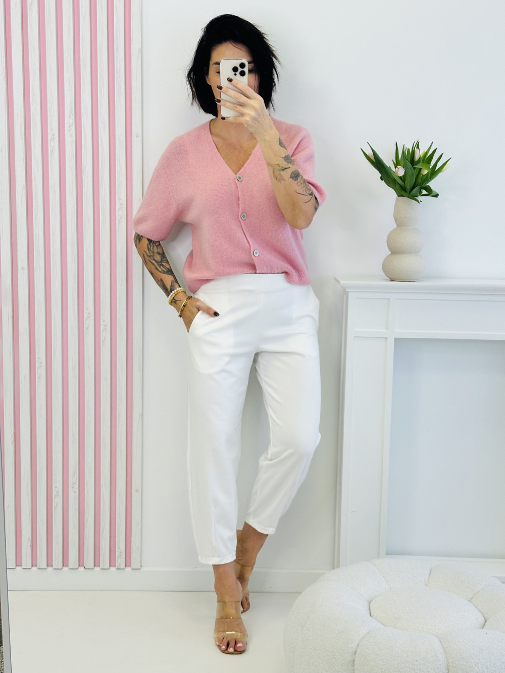 Stylowy sweter z krótkim rękawem zapinany na guziki to doskonałe połączenie elegancji i wygody. Wykonany z miękkiego, przyjemnego w dotyku materiału, pięknie układa się na sylwetce i dodaje klasy każdej stylizacji. Guziki z przodu nadają mu subtelnego, kobiecego charakteru, dzięki czemu sprawdzi się zarówno na co dzień, jak i w bardziej eleganckich zestawach.