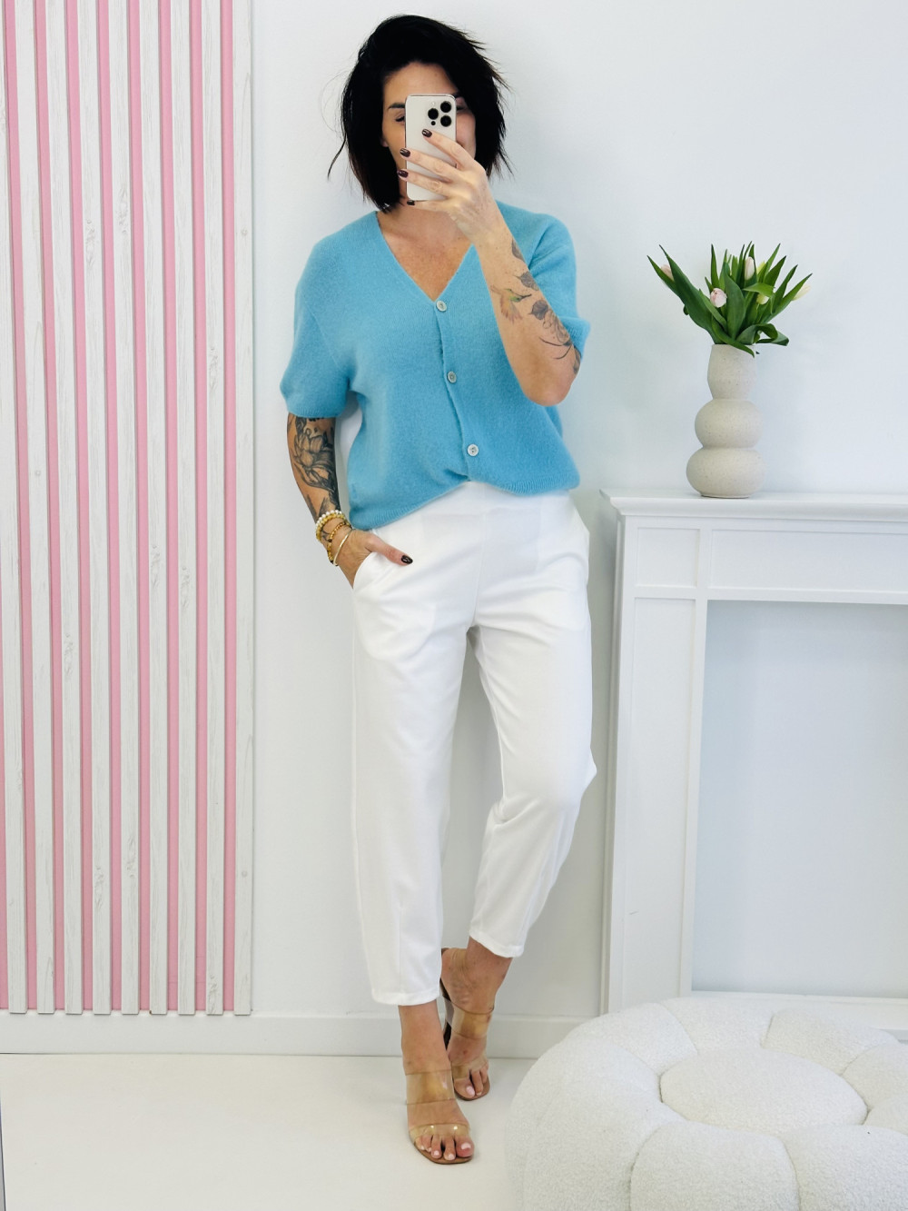 Stylowy sweter z krótkim rękawem zapinany na guziki to doskonałe połączenie elegancji i wygody. Wykonany z miękkiego, przyjemnego w dotyku materiału, pięknie układa się na sylwetce i dodaje klasy każdej stylizacji. Guziki z przodu nadają mu subtelnego, kobiecego charakteru, dzięki czemu sprawdzi się zarówno na co dzień, jak i w bardziej eleganckich zestawach.