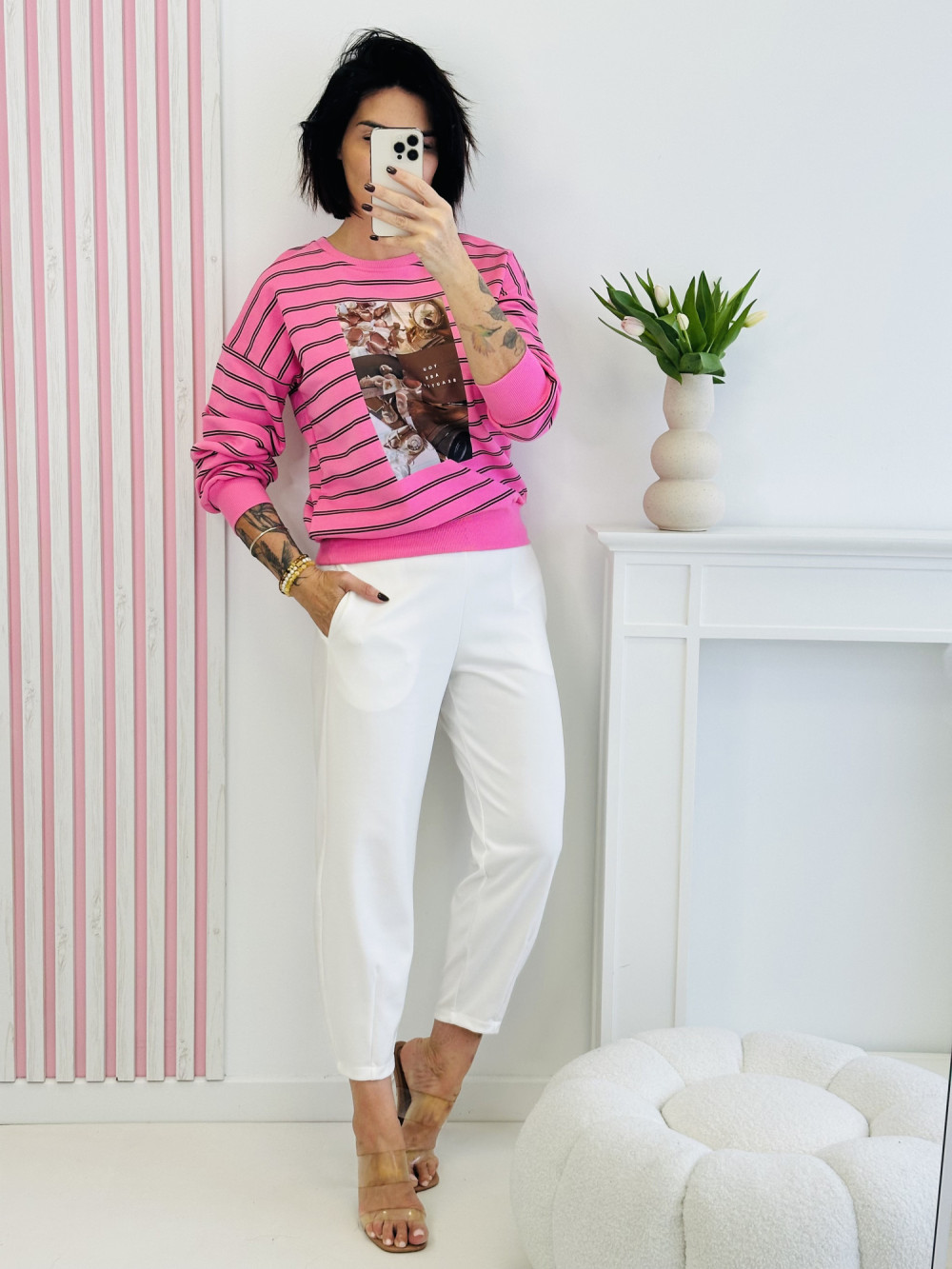 Urocza różowa bluza w paski to połączenie dziewczęcego stylu i wygody na co dzień. Ozdobiona aplikacją na środku, przyciąga wzrok subtelnym detalem, który dodaje jej wyjątkowego charakteru. Długi rękaw oraz miękki, przyjemny w dotyku materiał sprawiają, że bluza idealnie sprawdzi się w chłodniejsze dni, zapewniając komfort i stylowy wygląd.