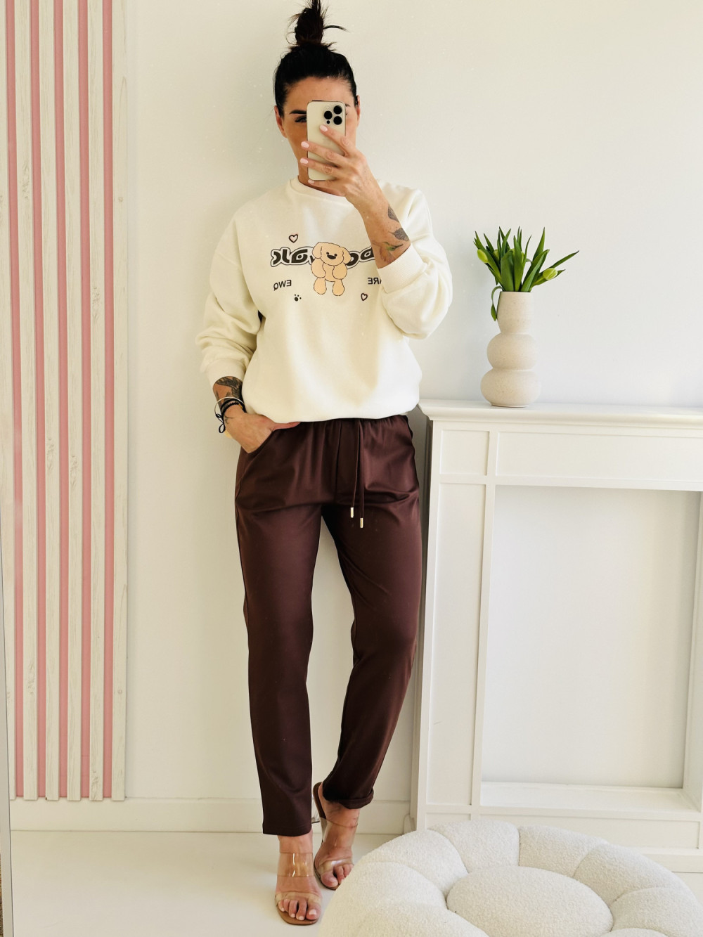 Kremowa bluza z długim rękawem to połączenie elegancji i wygody w codziennym wydaniu. Ozdobiona stylową aplikacją z przodu i z tyłu, wyróżnia się subtelnym, a jednocześnie efektownym designem. Miękki materiał i klasyczny krój sprawiają, że doskonale dopasowuje się do sylwetki, tworząc gustowny i modny look.
