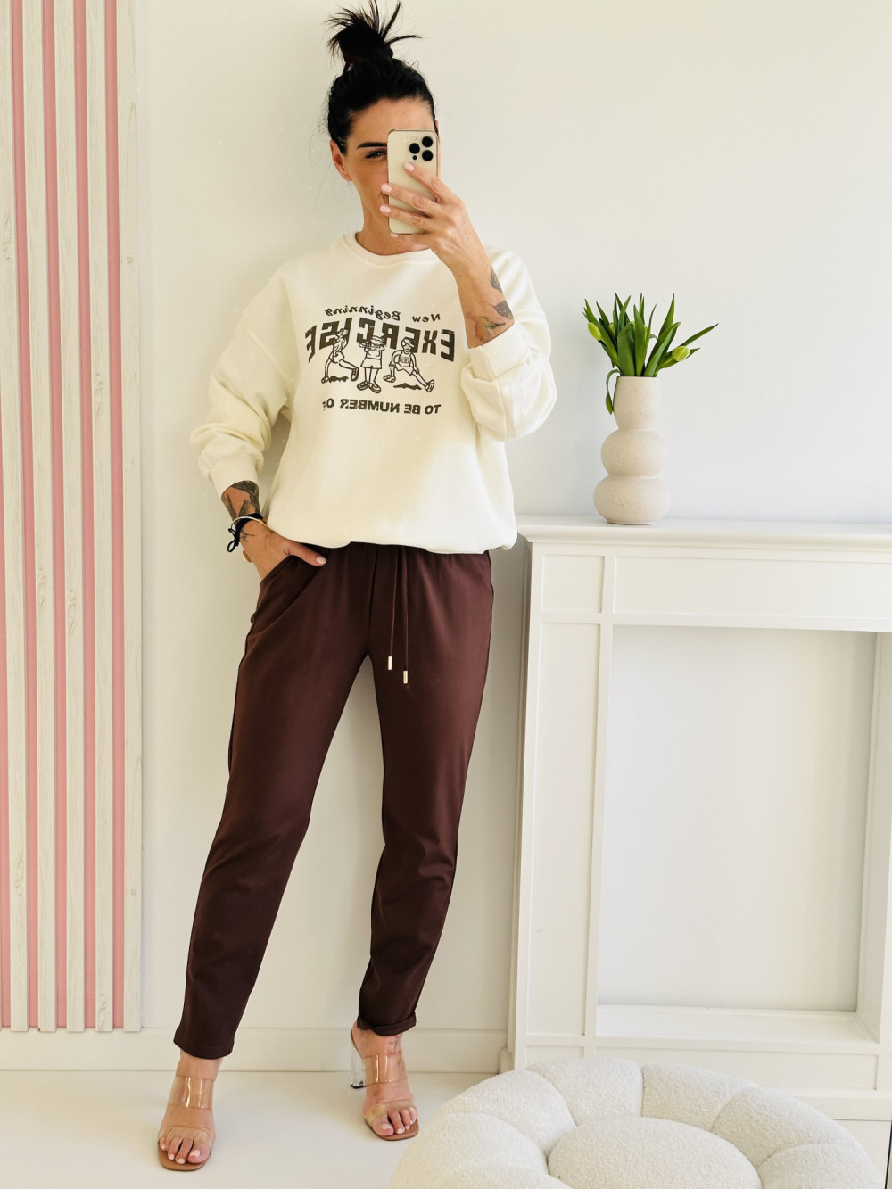 Kremowa bluza z długim rękawem to połączenie elegancji i wygody w codziennym wydaniu. Ozdobiona stylową aplikacją z przodu i z tyłu, wyróżnia się subtelnym, a jednocześnie efektownym designem. Miękki materiał i klasyczny krój sprawiają, że doskonale dopasowuje się do sylwetki, tworząc gustowny i modny look.