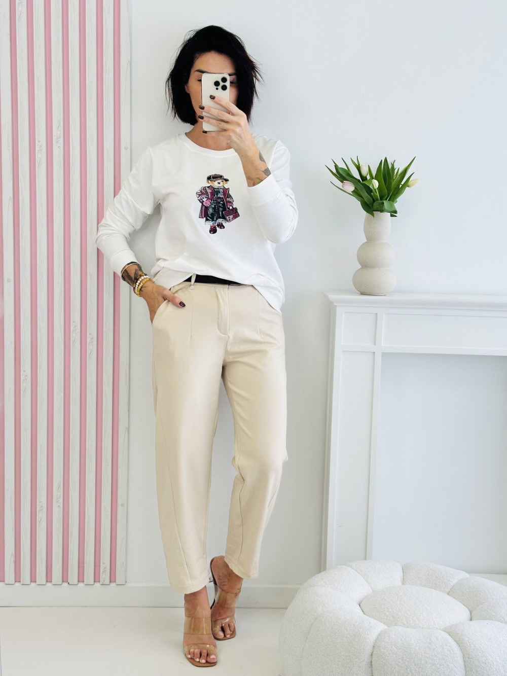 Kremowa bluza z długim rękawem to wygodna i stylowa propozycja na co dzień. Z przodu zdobi ją delikatna aplikacja, która dodaje całości subtelnego uroku i oryginalnego charakteru. Miękki, przyjemny w dotyku materiał zapewnia komfort noszenia, tworząc modną i przytulną stylizację.