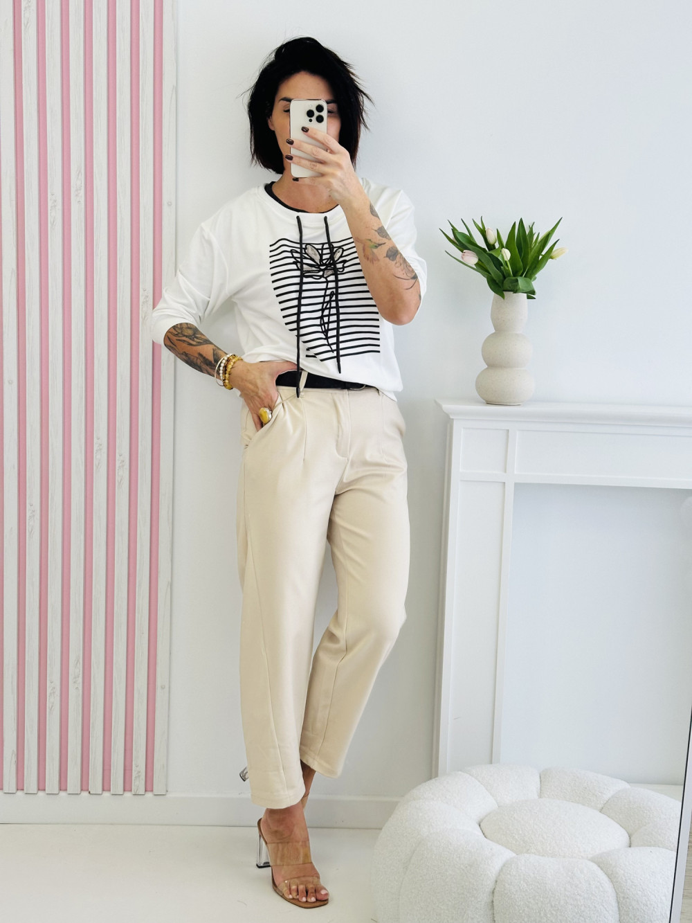 Bluza z rękawem 3/4 ozdobiona brązowym kwiatkiem z przodu to stylowa propozycja, która łączy wygodę z subtelnym, kobiecym akcentem. Delikatna aplikacja dodaje całości wyjątkowego charakteru i przyciąga wzrok. Miękki, przyjemny w dotyku materiał zapewnia komfort noszenia, sprawiając, że bluza świetnie sprawdzi się w codziennych stylizacjach.