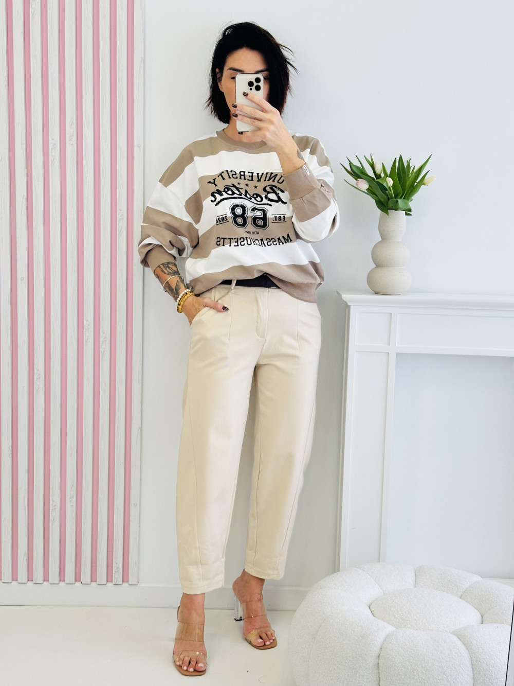 Bluza w paski w odcieniach brązu i bieli z długim rękawem to modna i wygodna propozycja na co dzień. Z przodu zdobi ją czarny napis, który dodaje całości nowoczesnego charakteru i przyciąga wzrok. Miękki, przyjemny w dotyku materiał zapewnia komfort noszenia, tworząc stylowy i swobodny look.