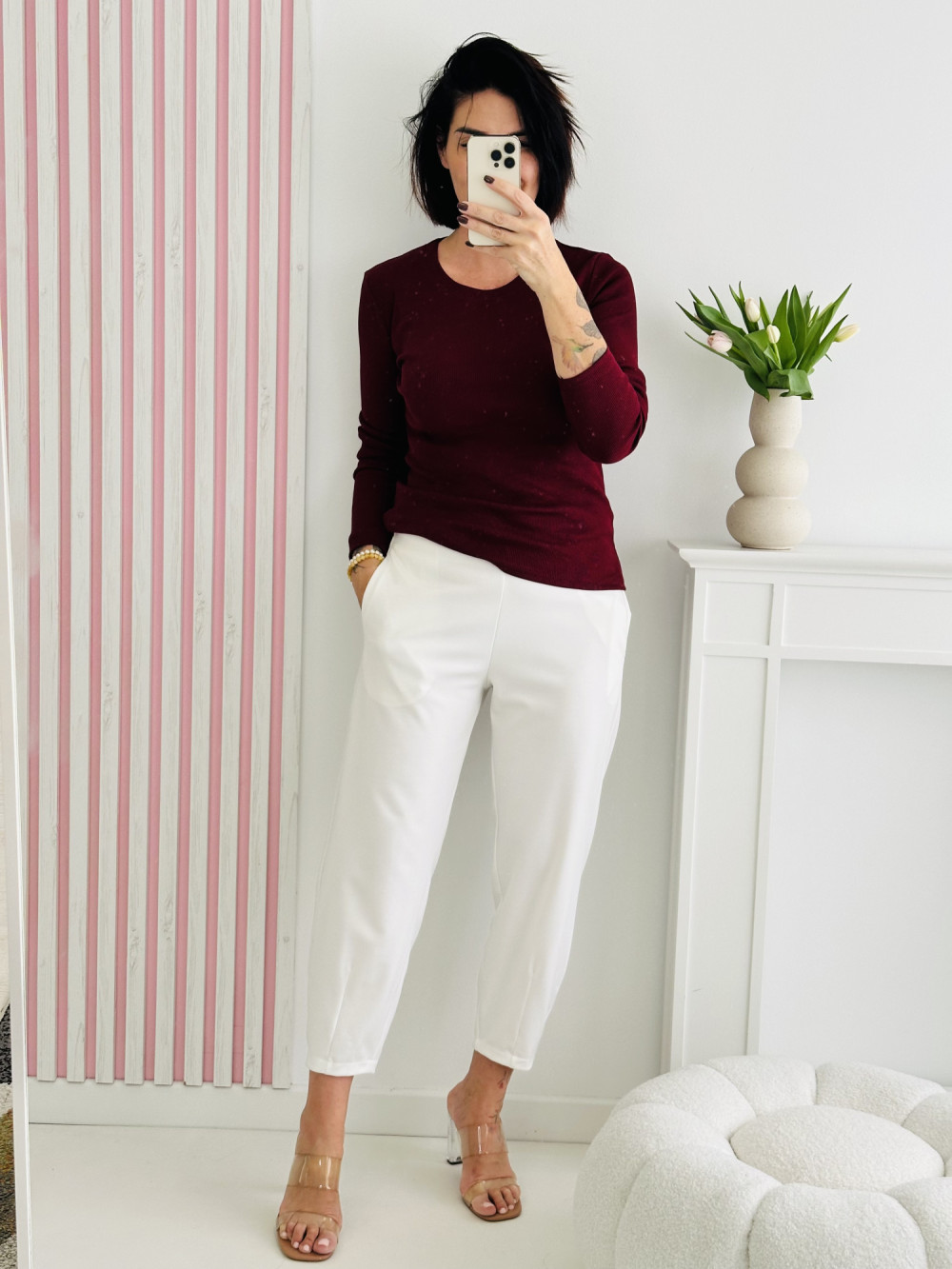 Burgundowa bluzka z długim rękawem wykonana z prążkowanego materiału to elegancka i kobieca propozycja na każdą okazję. Elastyczna tkanina pięknie dopasowuje się do sylwetki, podkreślając jej atuty, a głęboki odcień burgundu dodaje szyku i klasy. Doskonała zarówno do codziennych stylizacji, jak i bardziej eleganckich zestawów.