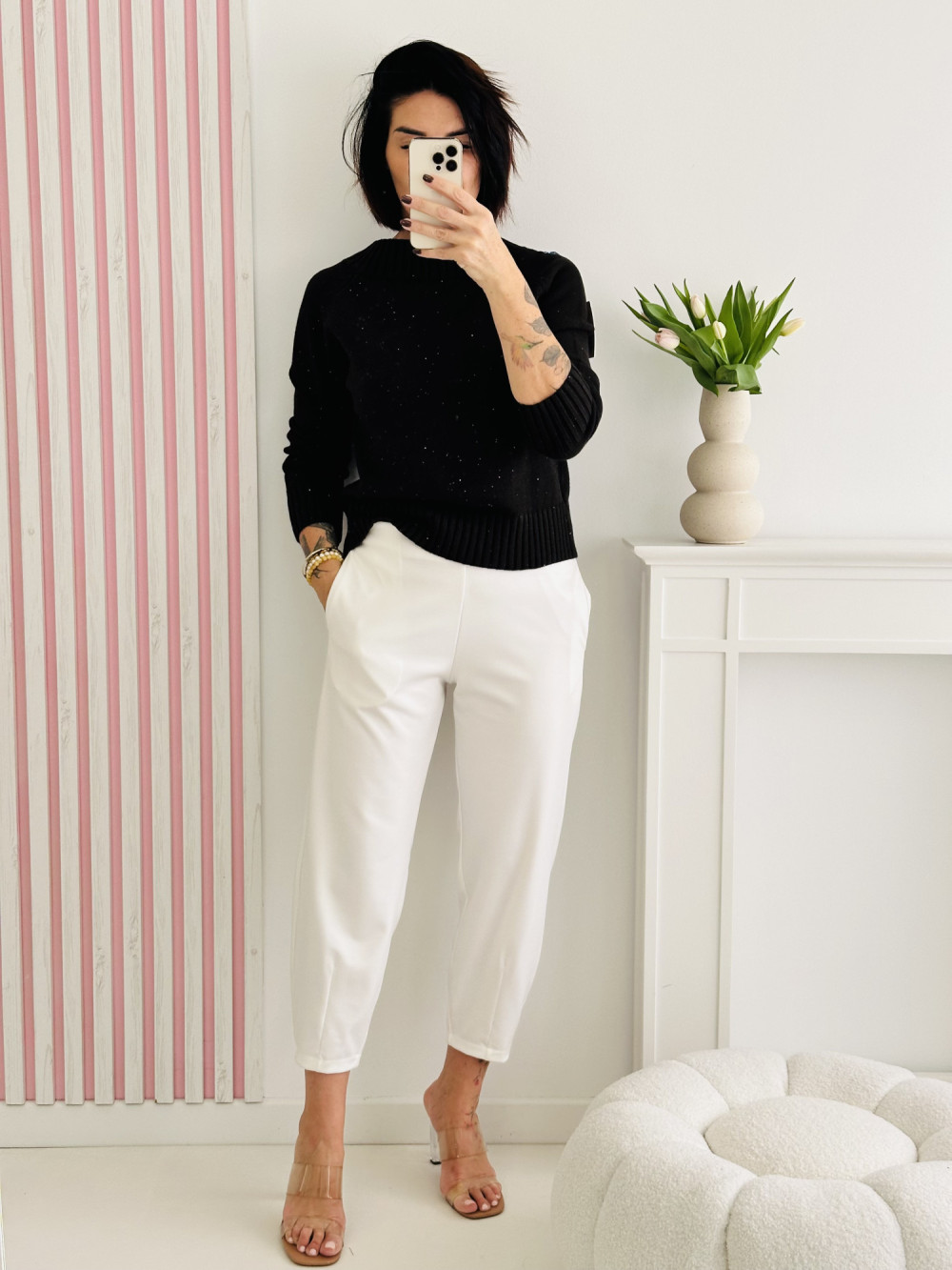 Sweter z długim rękawem ozdobiony drobnymi cekinami to połączenie klasy i delikatnego blasku. Subtelnie połyskujące zdobienia dodają mu elegancji, jednocześnie zachowując jego uniwersalny, kobiecy charakter. Wykonany z miękkiego i przyjemnego w dotyku materiału, zapewnia komfort noszenia i świetnie sprawdzi się zarówno na co dzień, jak i podczas wyjątkowych okazji.