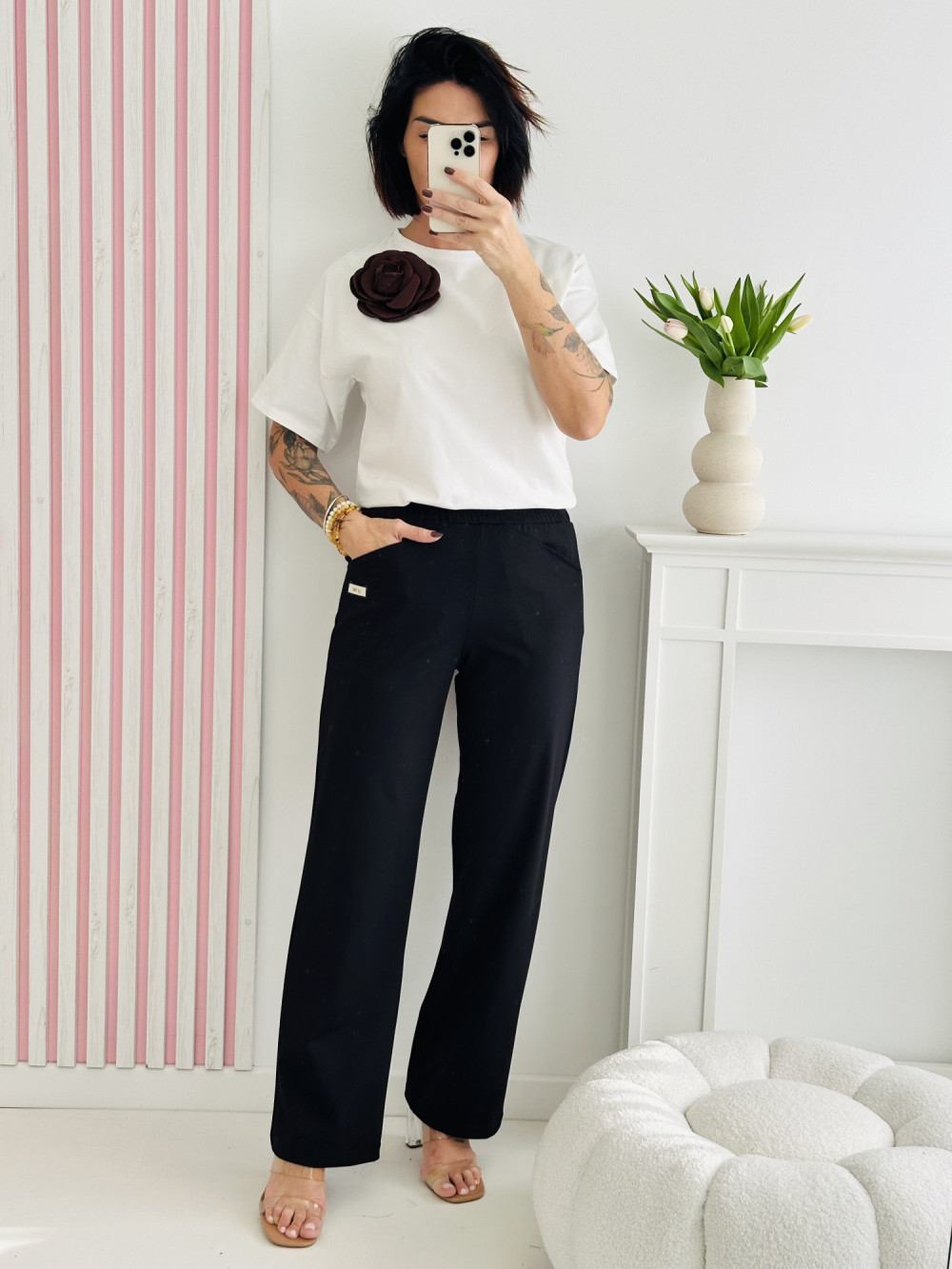 Biała bluzka z krótkim rękawem to elegancka i kobieca propozycja, wyróżniająca się brązową broszką w kształcie kwiatka. Subtelny detal dodaje jej wyjątkowego uroku i delikatnego, romantycznego akcentu. Wykonana z lekkiego, przyjemnego materiału, doskonale sprawdzi się zarówno w codziennych, jak i bardziej eleganckich stylizacjach.