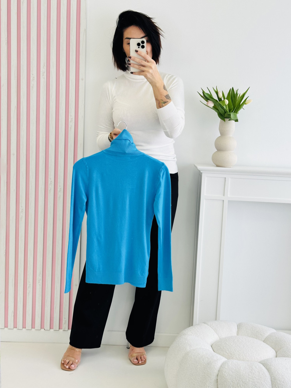 Sweter z długim rękawem i golfem to klasyczna i elegancka propozycja na chłodniejsze dni. Miękki, przyjemny w dotyku materiał zapewnia komfort i ciepło, a dopasowany krój subtelnie podkreśla sylwetkę. Uniwersalny design sprawia, że sweter doskonale komponuje się zarówno z jeansami, jak i spódnicą, tworząc stylowy i ponadczasowy look.