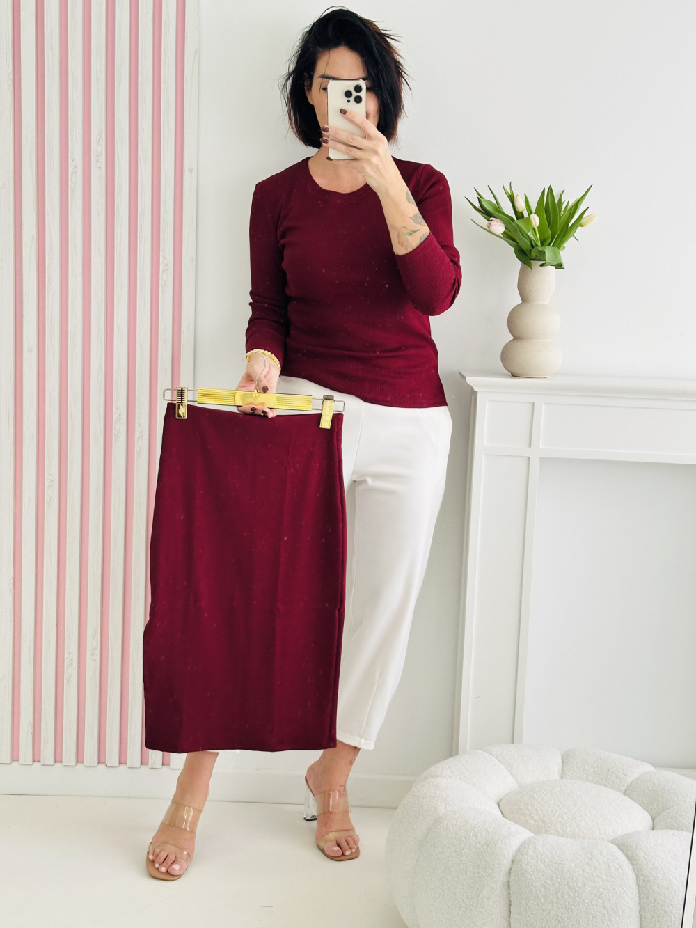 Spódnica z gumką w pasie oraz subtelnym rozcięciem to połączenie wygody i elegancji w jednym. Elastyczna talia zapewnia idealne dopasowanie, a rozcięcie dodaje lekkości i subtelnego, kobiecego charakteru. Wykonana z miękkiego materiału, doskonale sprawdzi się zarówno w codziennych, jak i bardziej eleganckich stylizacjach.