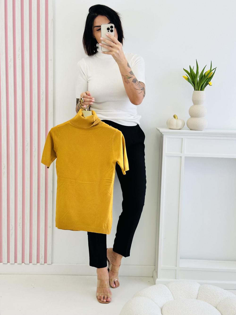 Sweter z golfem i krótkim rękawem to stylowa propozycja łącząca elegancję z nowoczesnym charakterem. Delikatny golf dodaje całości szyku, a krótkie rękawy sprawiają, że model doskonale sprawdzi się o każdej porze roku. Wykonany z miękkiego, przyjemnego w dotyku materiału, zapewnia komfort noszenia i świetnie komponuje się zarówno z eleganckimi spodniami, jak i spódnicą.