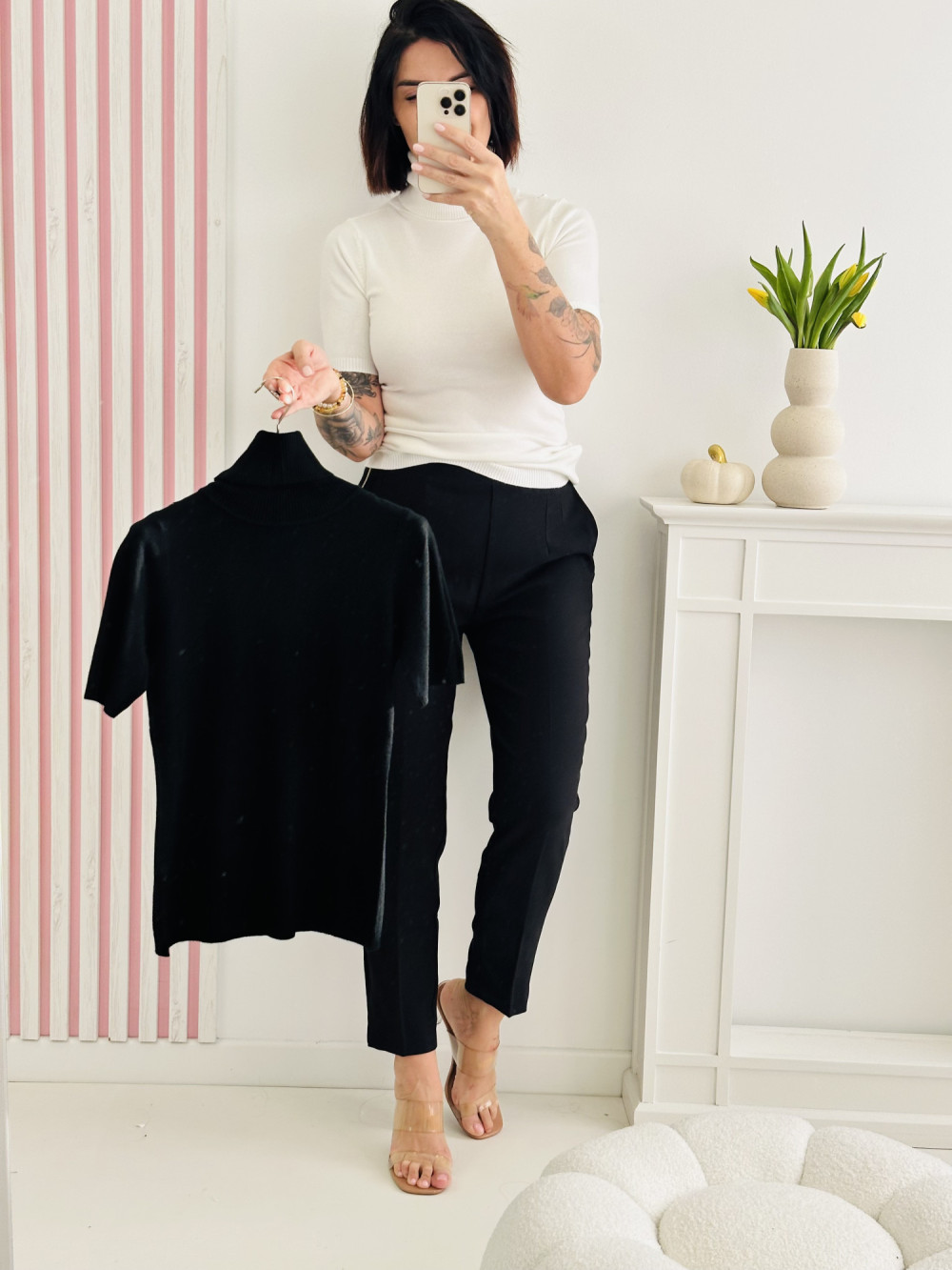 Sweter z golfem i krótkim rękawem to stylowa propozycja łącząca elegancję z nowoczesnym charakterem. Delikatny golf dodaje całości szyku, a krótkie rękawy sprawiają, że model doskonale sprawdzi się o każdej porze roku. Wykonany z miękkiego, przyjemnego w dotyku materiału, zapewnia komfort noszenia i świetnie komponuje się zarówno z eleganckimi spodniami, jak i spódnicą.