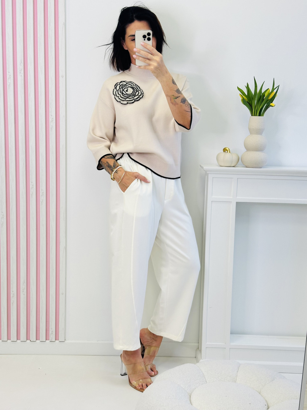 Sweter z półgolfem i rękawem 3/4 to elegancka i kobieca propozycja, idealna na każdą okazję. Uroku dodaje mu duża broszka w kształcie kwiata, utrzymana w kolorze swetra, która stanowi efektowny, a zarazem subtelny akcent. Wykonany z miękkiego, przyjemnego w dotyku materiału, zapewnia komfort noszenia i prezentuje się niezwykle stylowo zarówno w codziennych, jak i bardziej eleganckich stylizacjach.