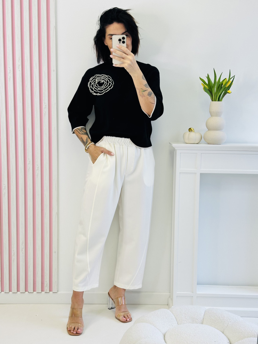 Sweter z półgolfem i rękawem 3/4 to elegancka i kobieca propozycja, idealna na każdą okazję. Uroku dodaje mu duża broszka w kształcie kwiata, utrzymana w kolorze swetra, która stanowi efektowny, a zarazem subtelny akcent. Wykonany z miękkiego, przyjemnego w dotyku materiału, zapewnia komfort noszenia i prezentuje się niezwykle stylowo zarówno w codziennych, jak i bardziej eleganckich stylizacjach.