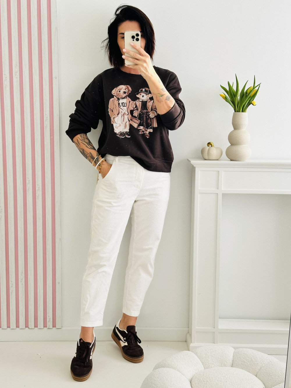 Bluza z długim rękawem ozdobiona aplikacją dwóch eleganckich misiów na przodzie to urocza i stylowa propozycja na co dzień. Starannie wykonane detale dodają jej wyjątkowego charakteru i delikatnego, modowego uroku. Miękki, przyjemny w dotyku materiał zapewnia komfort noszenia, a klasyczny krój sprawia, że bluza świetnie pasuje do wielu casualowych stylizacji.