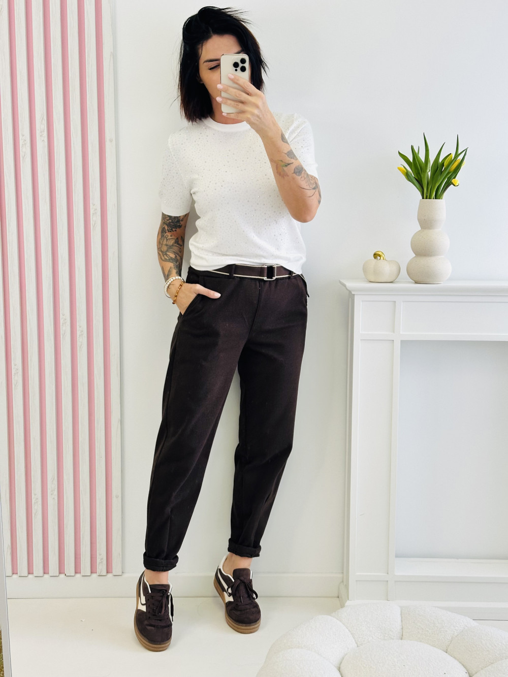 Stylowy sweter z krótkim rękawem to elegancka propozycja dla kobiet ceniących subtelny blask. Przód ozdobiony jest połyskującymi kryształkami, które dodają mu wyjątkowego uroku i klasy. Wykonany z przyjemnego w dotyku materiału, zapewnia komfort i doskonale sprawdzi się zarówno na co dzień, jak i na wyjątkowe okazje.