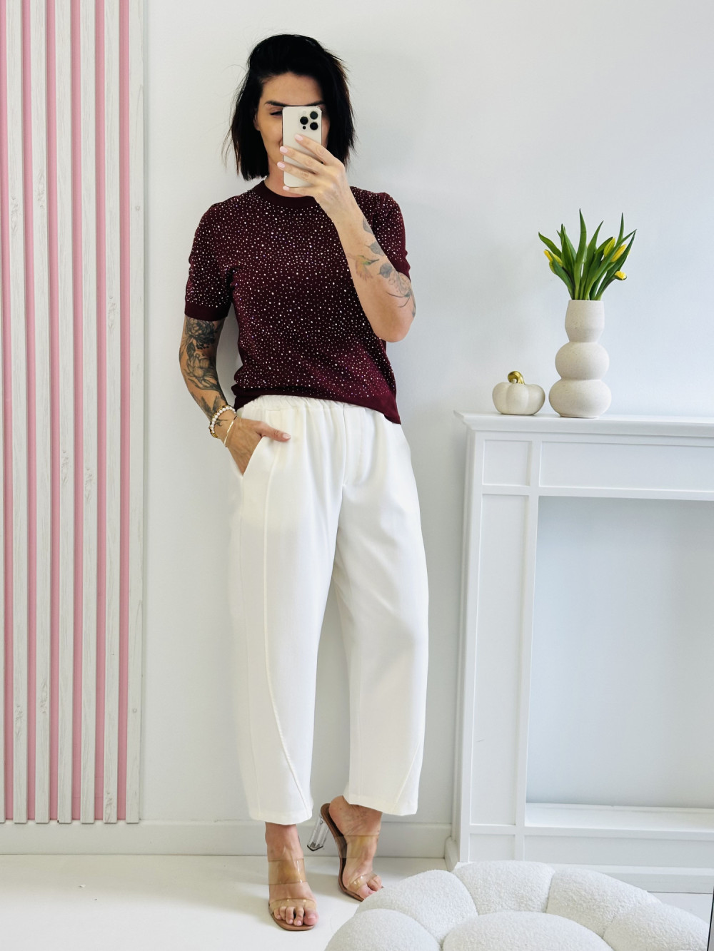 Stylowy sweter z krótkim rękawem to elegancka propozycja dla kobiet ceniących subtelny blask. Przód ozdobiony jest połyskującymi kryształkami, które dodają mu wyjątkowego uroku i klasy. Wykonany z przyjemnego w dotyku materiału, zapewnia komfort i doskonale sprawdzi się zarówno na co dzień, jak i na wyjątkowe okazje.