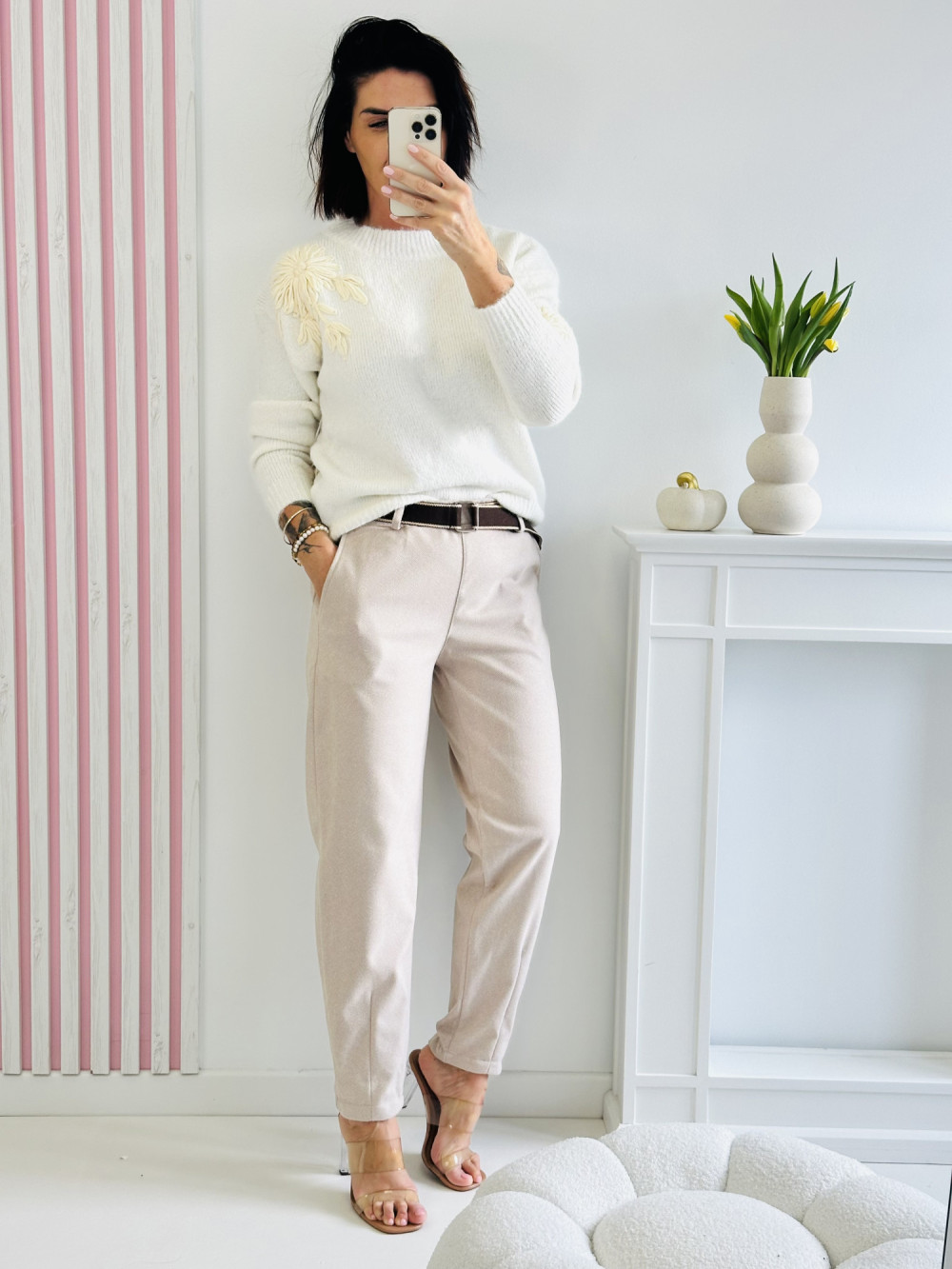 Sweter z długim rękawem ozdobiony naszytymi kwiatami to połączenie elegancji i subtelnej kobiecości. Delikatne kwiatowe aplikacje dodają mu wyjątkowego charakteru i przyciągają wzrok, tworząc modny akcent w stylizacji. Wykonany z miękkiego, przyjemnego w dotyku materiału, zapewnia komfort noszenia i doskonale sprawdzi się zarówno na co dzień, jak i na specjalne okazje.