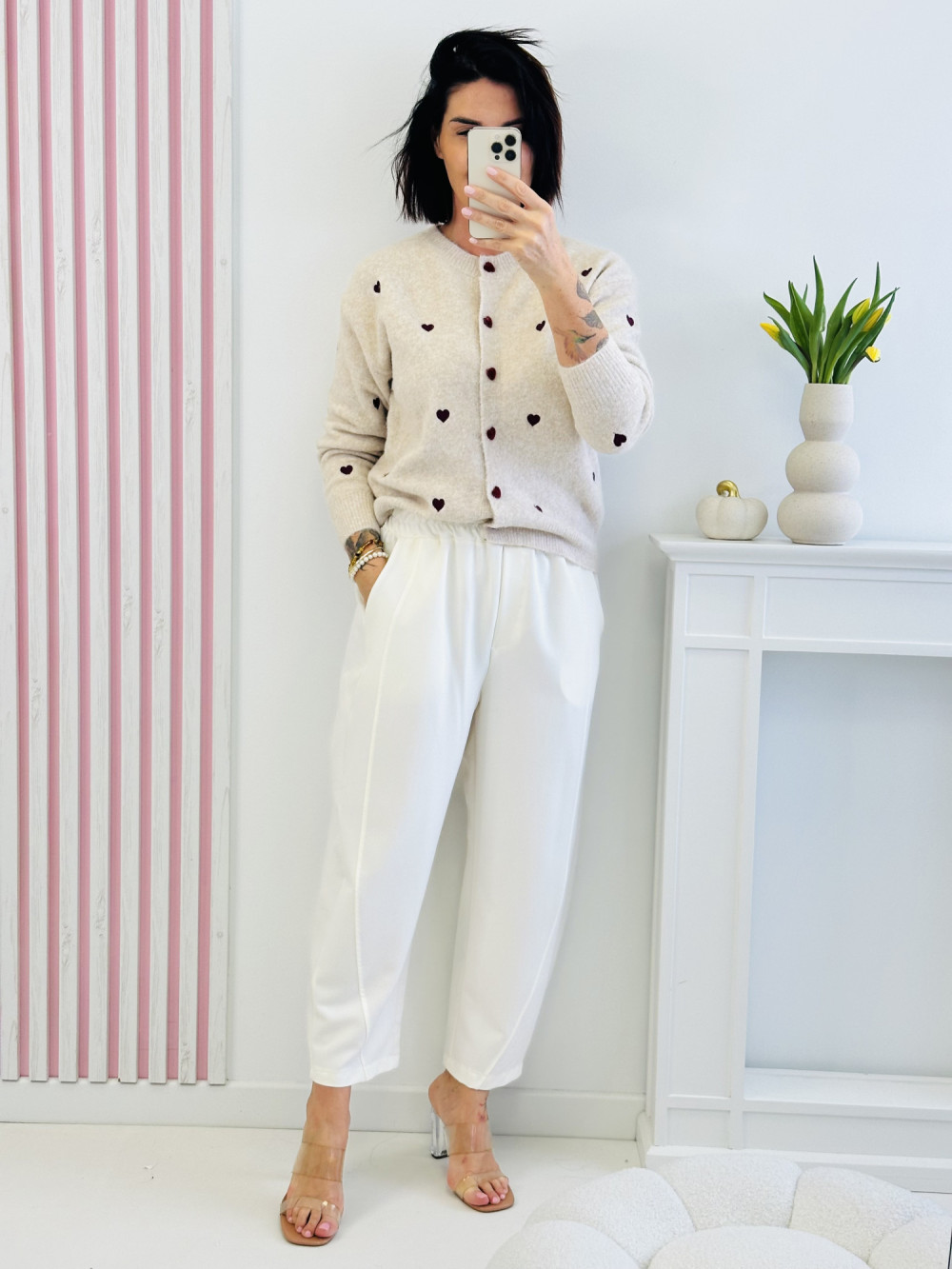 Sweter z długim rękawem ozdobiony mnóstwem małych serduszek na przodzie to urocza i kobieca propozycja na co dzień. Delikatny motyw serc dodaje mu subtelnego uroku i wyjątkowego charakteru, przyciągając wzrok w elegancki sposób. Wykonany z miękkiego, przyjemnego w dotyku materiału, zapewnia komfort noszenia i doskonale komponuje się z casualowymi i stylowymi zestawami.
