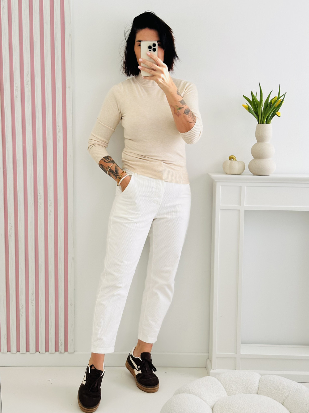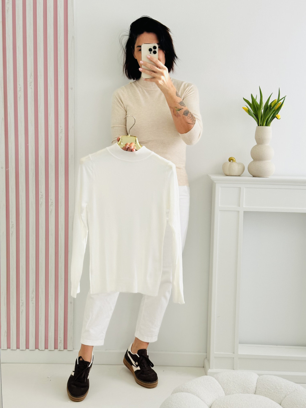 Sweter z długim rękawem i półgolfem to klasyczna i elegancka propozycja na chłodniejsze dni. Miękki, przyjemny w dotyku materiał zapewnia komfort noszenia, a półgolf subtelnie chroni szyję, dodając całości szykownego charakteru. Uniwersalny krój sprawia, że sweter doskonale komponuje się zarówno z eleganckimi spodniami, jak i casualowymi zestawami.