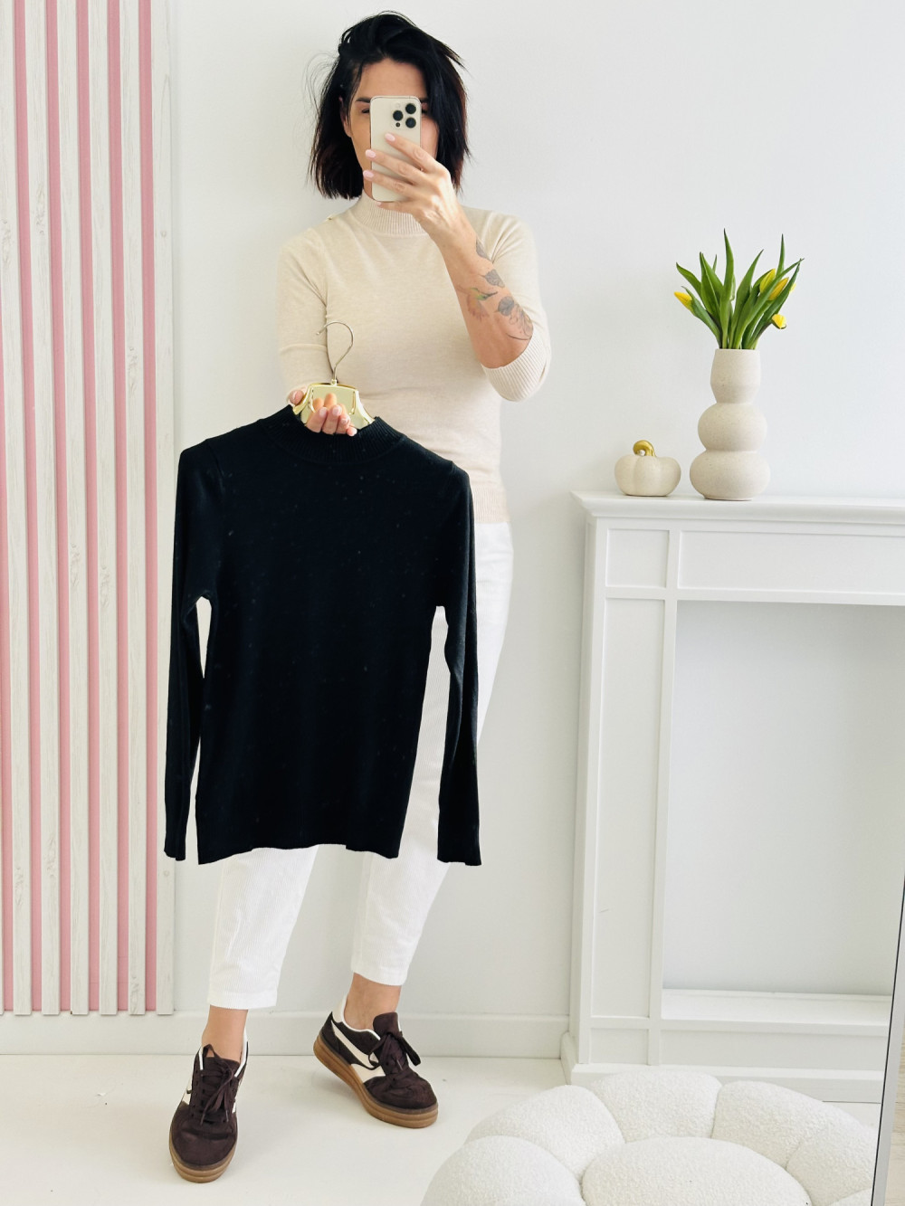 Sweter z długim rękawem i półgolfem to klasyczna i elegancka propozycja na chłodniejsze dni. Miękki, przyjemny w dotyku materiał zapewnia komfort noszenia, a półgolf subtelnie chroni szyję, dodając całości szykownego charakteru. Uniwersalny krój sprawia, że sweter doskonale komponuje się zarówno z eleganckimi spodniami, jak i casualowymi zestawami.