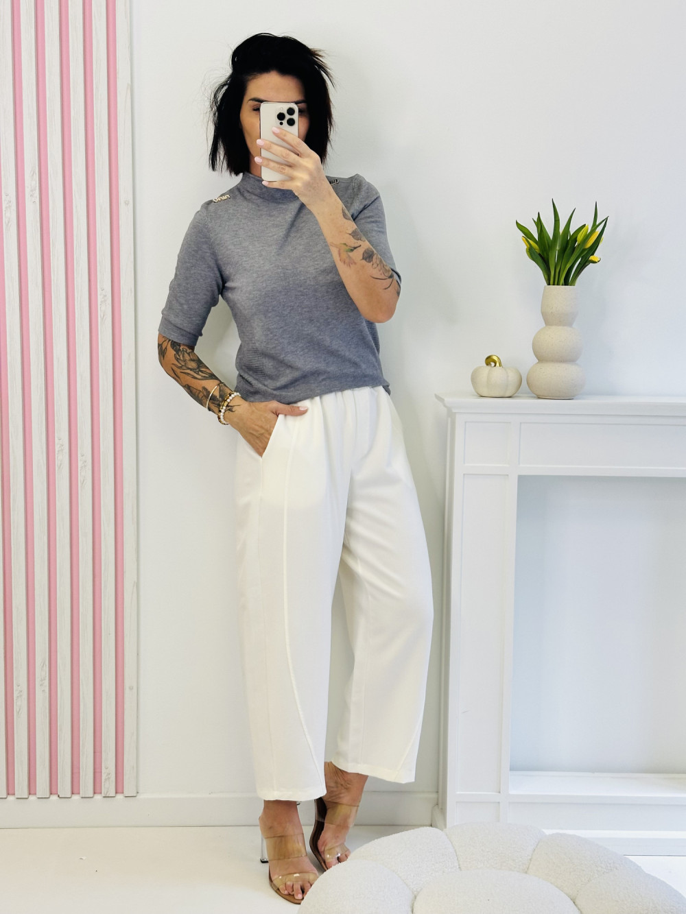 Bluzka z krótkim rękawem to subtelna i elegancka propozycja na co dzień. Dwie małe, złote aplikacje na ramionach dodają całości delikatnego, luksusowego akcentu i podkreślają kobiecy charakter stylizacji. Wykonana z miękkiego, przyjemnego w dotyku materiału, gwarantuje komfort noszenia i świetnie komponuje się z codziennymi oraz bardziej eleganckimi zestawami.