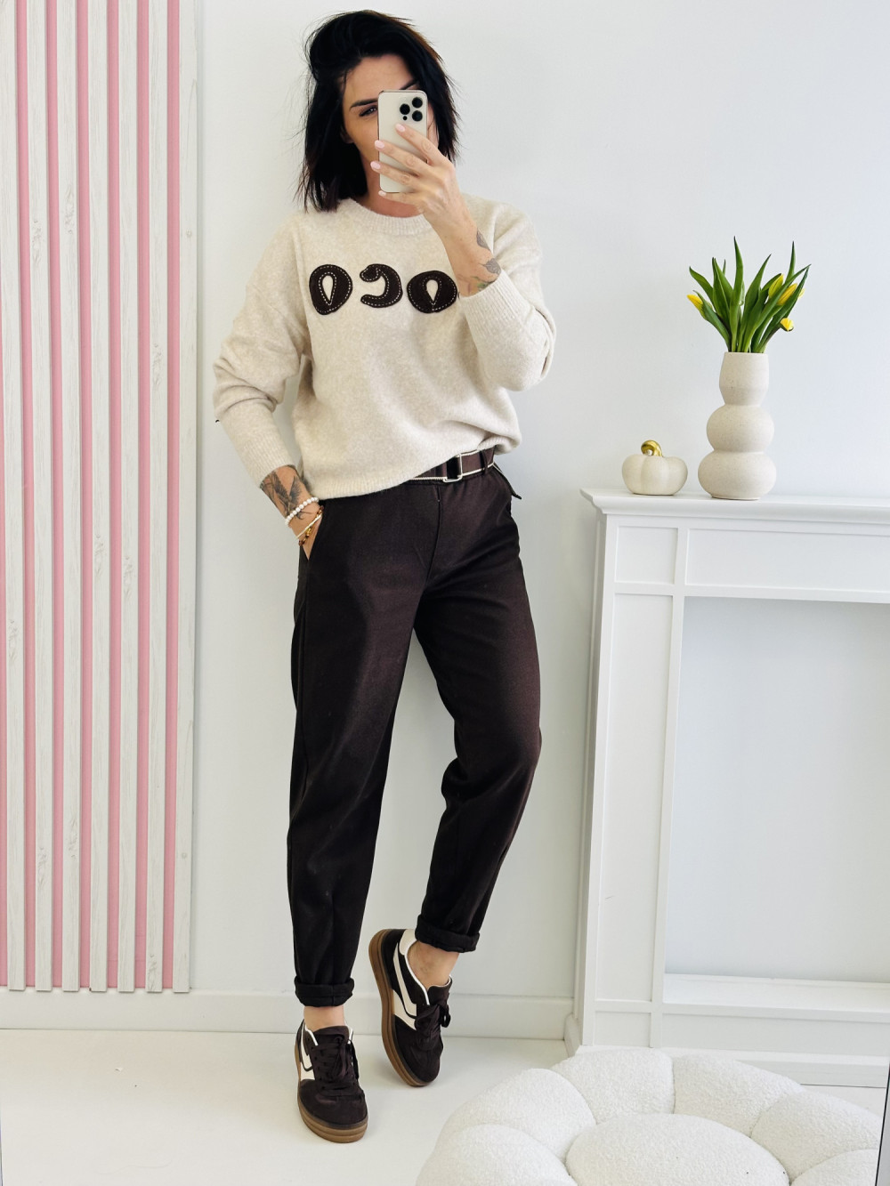 Beżowy sweter z długim rękawem to połączenie elegancji i codziennego komfortu. Z przodu zdobi go stylowy brązowy napis “COCO”, który dodaje całości modnego, paryskiego charakteru. Miękki i przyjemny w dotyku materiał sprawia, że sweter idealnie sprawdzi się zarówno w casualowych, jak i bardziej szykownych stylizacjach.