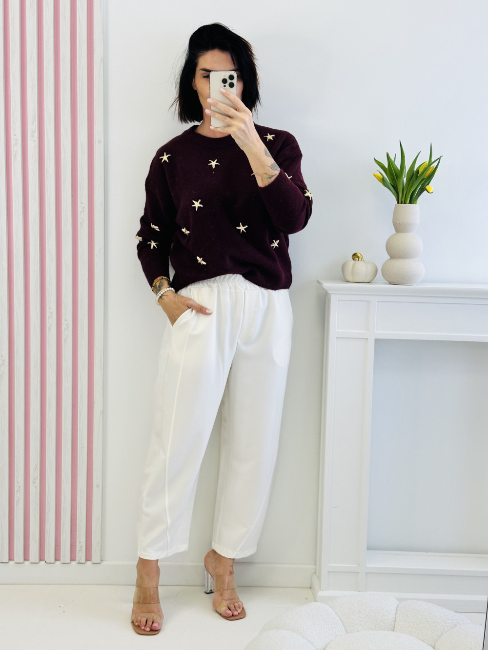 Burgundowy sweter z długim rękawem to wyjątkowa propozycja dla miłośniczek elegancji z nutą oryginalności. Przód ozdobiony jest złotymi gwiazdami morskimi, które subtelnie połyskują, nadając całości wyrafinowanego blasku. Wykonany z miękkiego, przyjemnego w dotyku materiału, doskonale łączy styl i wygodę – idealny na chłodniejsze dni.