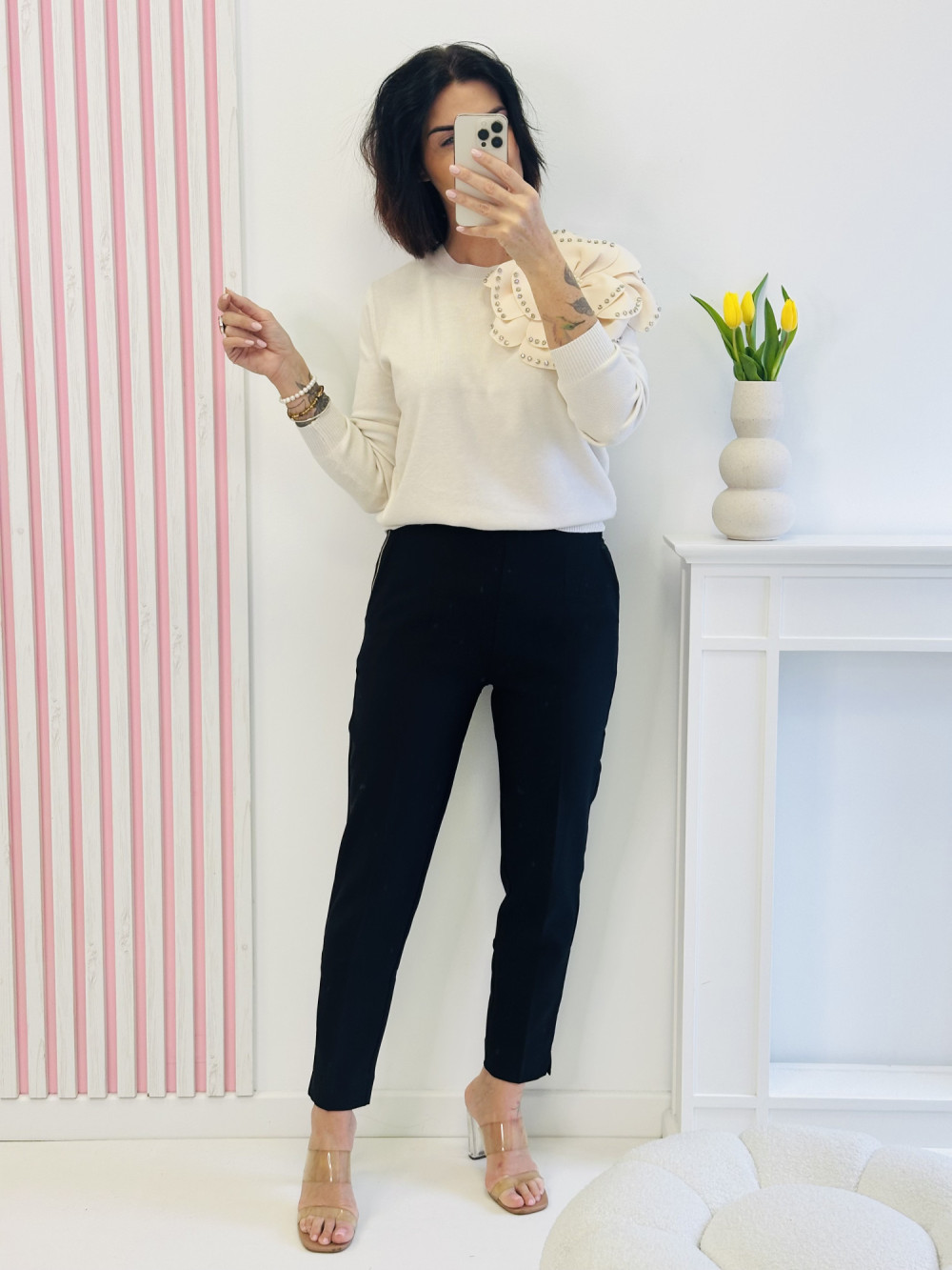 Stylowy sweter z długim rękawem ozdobiony dużą aplikacją kwiata z boku przodu to wyjątkowy element garderoby, który przyciąga wzrok i dodaje kobiecego uroku. Wykonany z miękkiego, przyjemnego materiału, zapewnia komfort i elegancki wygląd przez cały dzień. Delikatna aplikacja nadaje mu subtelnej oryginalności, czyniąc go idealnym wyborem na co dzień i na wyjątkowe okazje.