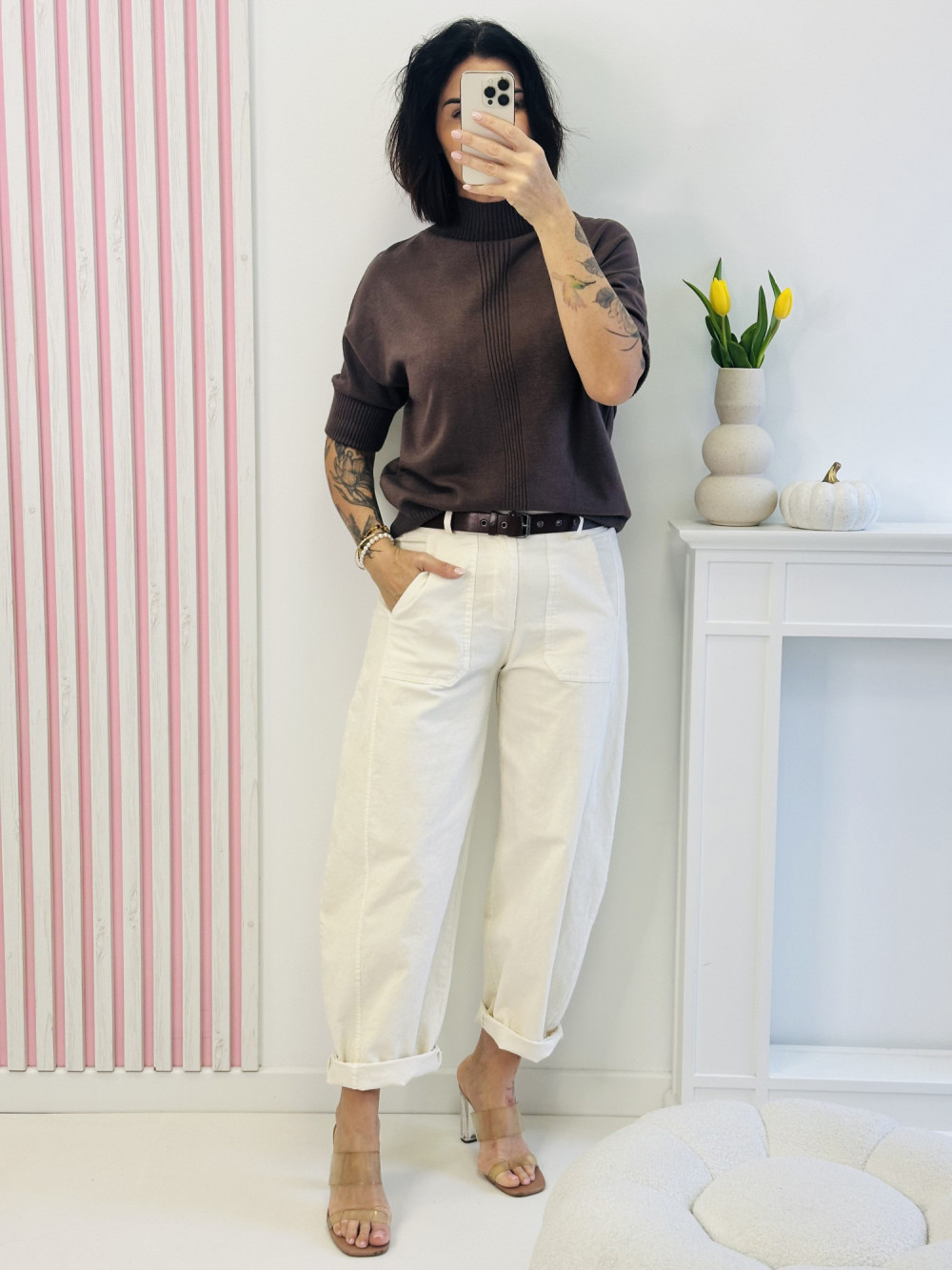 Elegancki sweter z rękawem 3/4 oraz półgolfem to doskonałe połączenie klasy i wygody. Wykonany z miękkiego, przyjemnego w dotyku materiału, otula sylwetkę, podkreślając jej kobiecy charakter. Subtelny półgolf dodaje całości szyku, czyniąc ten model idealnym wyborem zarówno do biura, jak i na codzienne stylizacje.