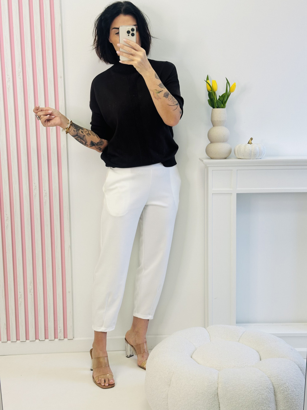 Elegancki sweter z rękawem 3/4 oraz półgolfem to doskonałe połączenie klasy i wygody. Wykonany z miękkiego, przyjemnego w dotyku materiału, otula sylwetkę, podkreślając jej kobiecy charakter. Subtelny półgolf dodaje całości szyku, czyniąc ten model idealnym wyborem zarówno do biura, jak i na codzienne stylizacje.