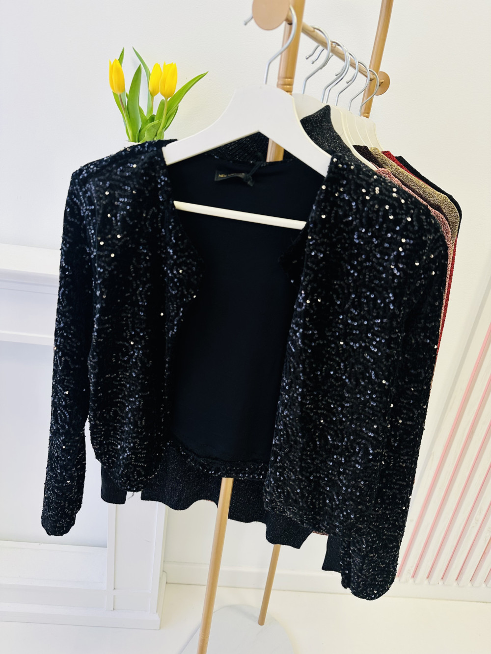 Krótka czarna marynarka z długim rękawem to kwintesencja elegancji z nutą nowoczesnego blasku. Delikatnie połyskujący materiał dodaje jej wyjątkowego charakteru i szyku. Idealna na wieczorne wyjścia lub stylowe spotkania — podkreśli każdą stylizację, nadając jej wyrafinowanego uroku.